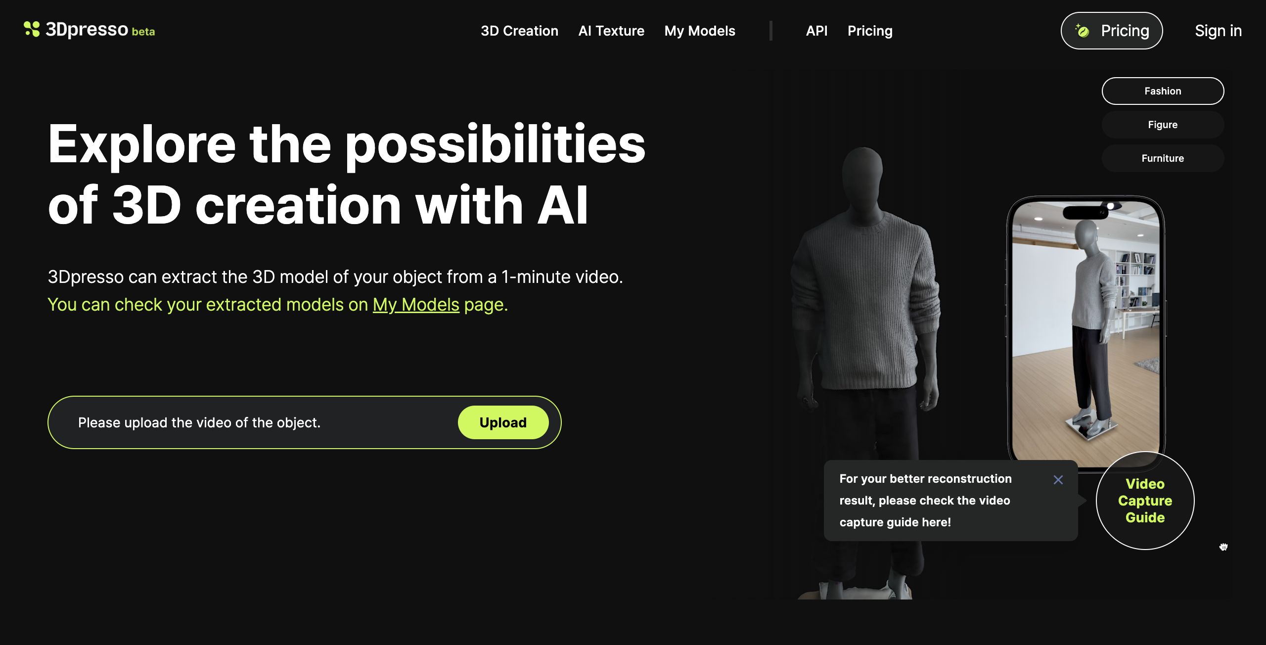 3Dpresso is an innovative online platform designed to simplify the process of creating 3D content. Using the power of AI, it allows creators to extract 3D models from a short video—typically around 1 to 2 minutes long—making the tool especially appealing for designers, digital artists, and anyone interested in 3D modeling without the need for complex software. Given the growing interest in accessible and automated 3D creation solutions, 3Dpresso stands out as a relevant and timely tool for creative professionals and enthusiasts alike.
