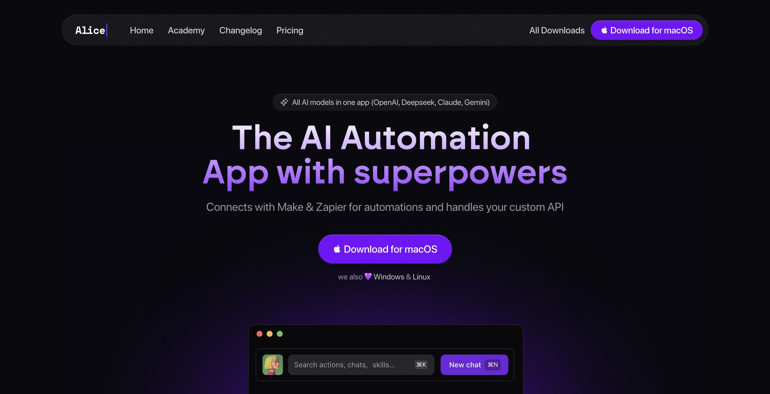 Alice App is an AI desktop assistant designed to automate a variety of tasks, enhancing productivity by leveraging advanced AI models such as GPT-4 and Claude. Crafted with a focus on privacy and a user-friendly interface, Alice App is tailored for productivity enthusiasts, teams, founders, and creators looking to streamline their daily tasks, from social media content creation to task management, coding, and more. In today’s rapidly evolving AI landscape, Alice App stands out as a robust tool that helps users save time by seamlessly integrating automation within their desktop environment.