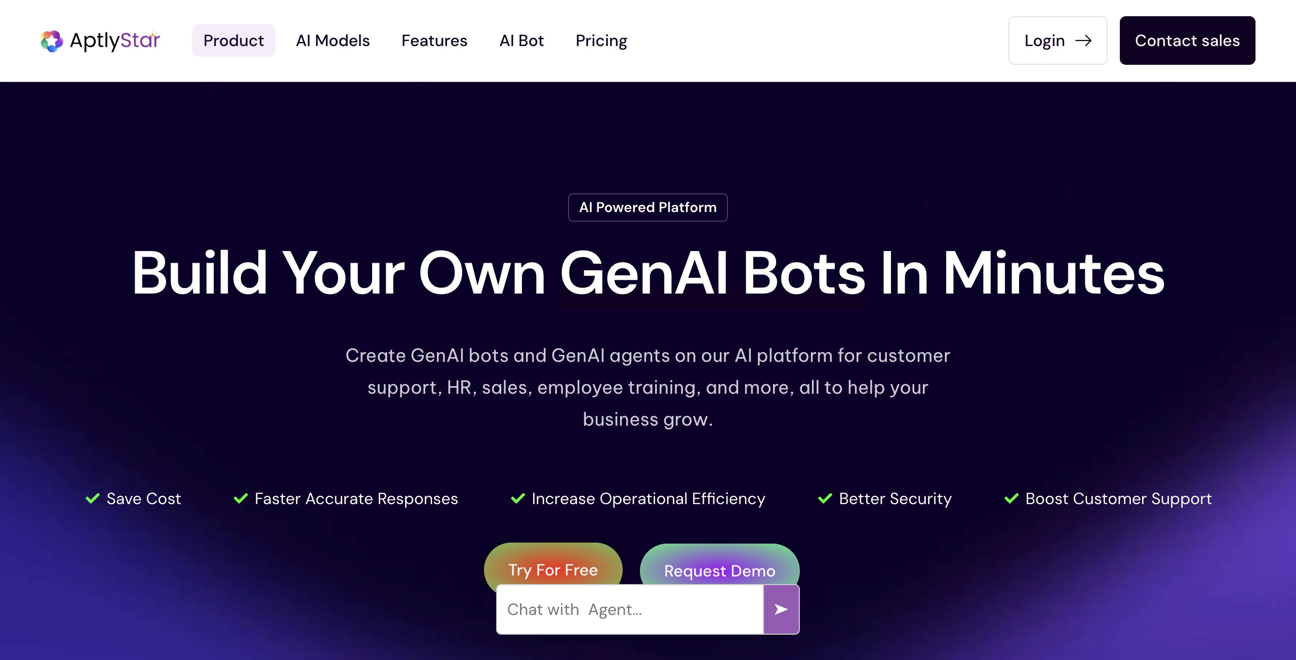 AptlyStar.ai is an AI-powered platform designed to help businesses create and deploy generative AI bots. This tool is tailored for business professionals in customer support, human resources, sales, and employee training sectors. Its relevance stems from the increasing need for automation in business processes, driving operational efficiency, and providing faster customer support with reduced costs.