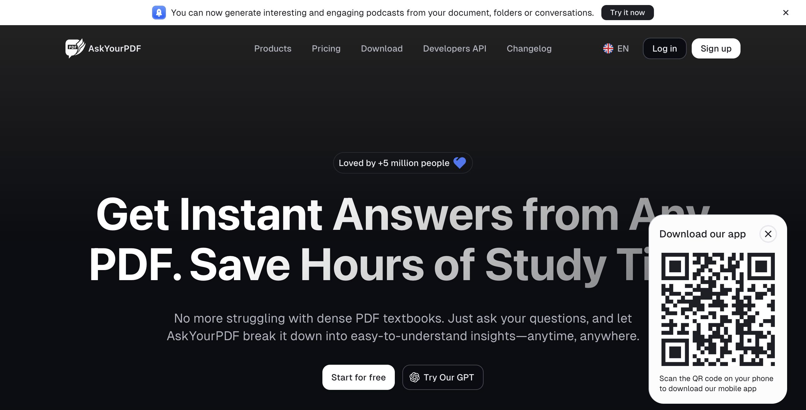 - Additional Use Cases: Beyond summarization, AskYourPDF even enables creative features such as generating engaging podcast-style content from documents, making the learning process both interactive and playful.