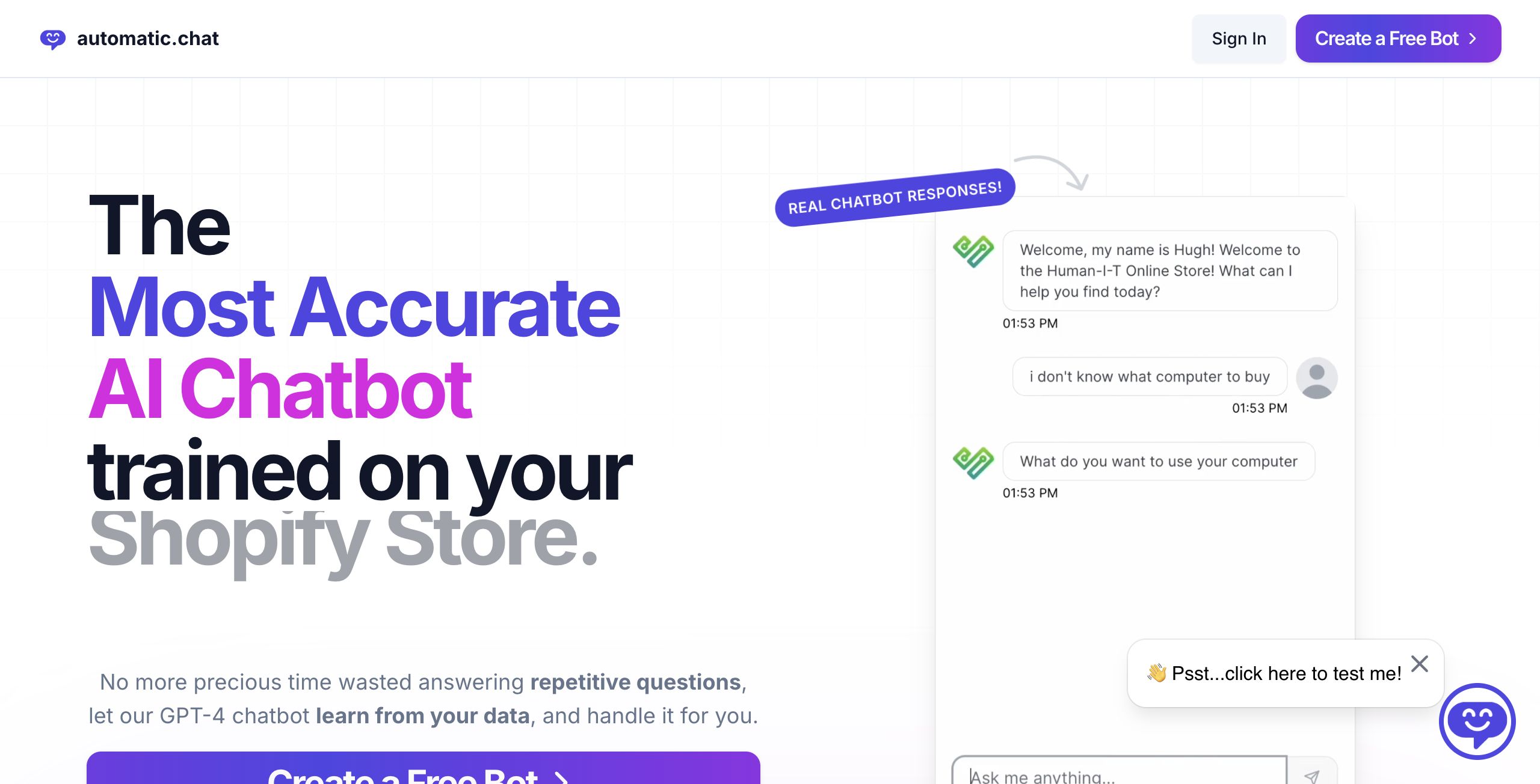 Automatic Chat is an AI-powered platform designed to create and manage chatbots for websites. Geared towards businesses and website owners who want to enhance customer engagement by providing instant answers, this tool leverages OpenAI’s GPT-4 to handle routine queries round the clock. With a focus on saving time and reducing the need for human customer support, Automatic Chat is highly relevant in today’s fast-paced digital environment where responsiveness and efficient communication are key.