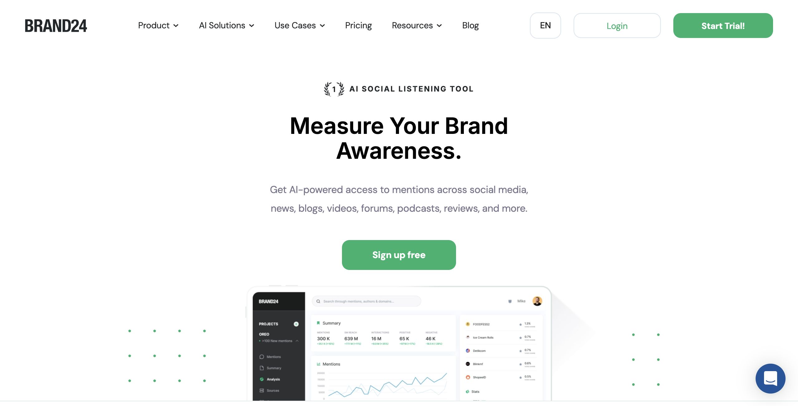 While specific pricing details are not provided within the available information, the repeated call-to-action messages such as "Start Trial!" and "Sign up free" suggest that Brand24 offers a free trial option. This indicates that potential users can test out the tool before committing to a subscription-based plan. Overall, the tool appears to offer substantial value by combining a comprehensive feature set with the opportunity to experience the service at no initial cost, making it a competitive option within its market segment.