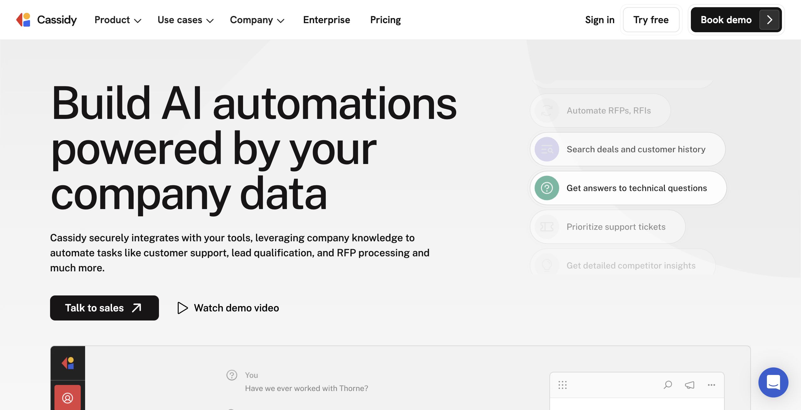 Cassidy is an AI-powered platform designed to automate business tasks by creating intelligent AI assistants and tailored workflows. Built to seamlessly integrate with a company’s existing tools and data sources—such as Slack, Notion, and LinkedIn—Cassidy targets enterprise teams looking to enhance their productivity through automation. In today’s fast-paced business environment, where efficiency and brand consistency are critical, Cassidy is reviewed for its ability to streamline routine tasks like customer support, lead qualification, and RFP processing, ultimately saving valuable time and resources.