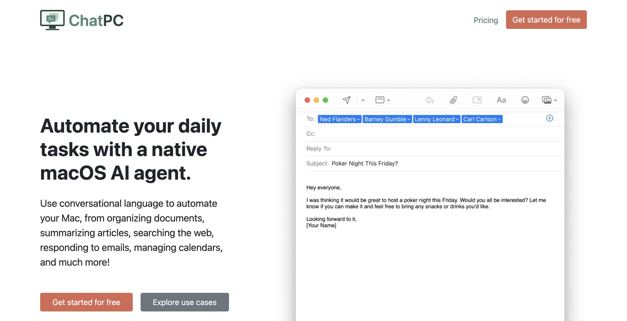 ChatPC is an AI-driven assistant for macOS that automates tasks with natural language commands. Seamlessly integrate with core apps to manage emails, organize files, and more, all while ensuring your privacy with end-to-end encryption and no data training usage.