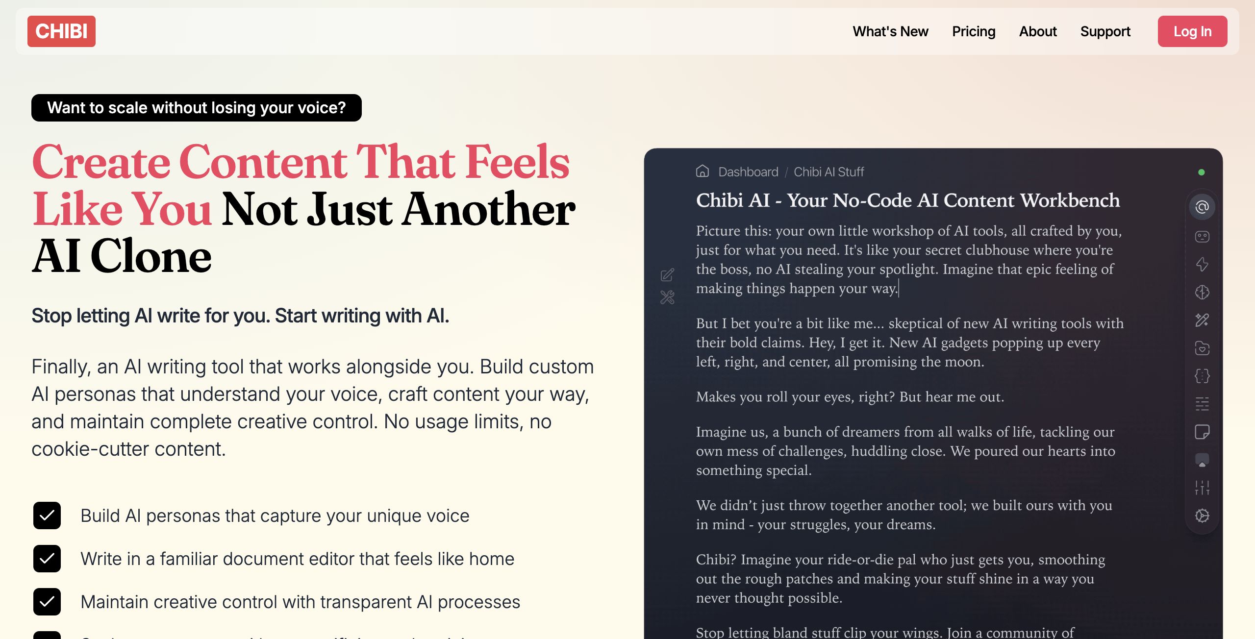 - Customizable AI Personas: Users can create and switch between multiple AI personas tailored to their unique voice, style, and specific content needs.