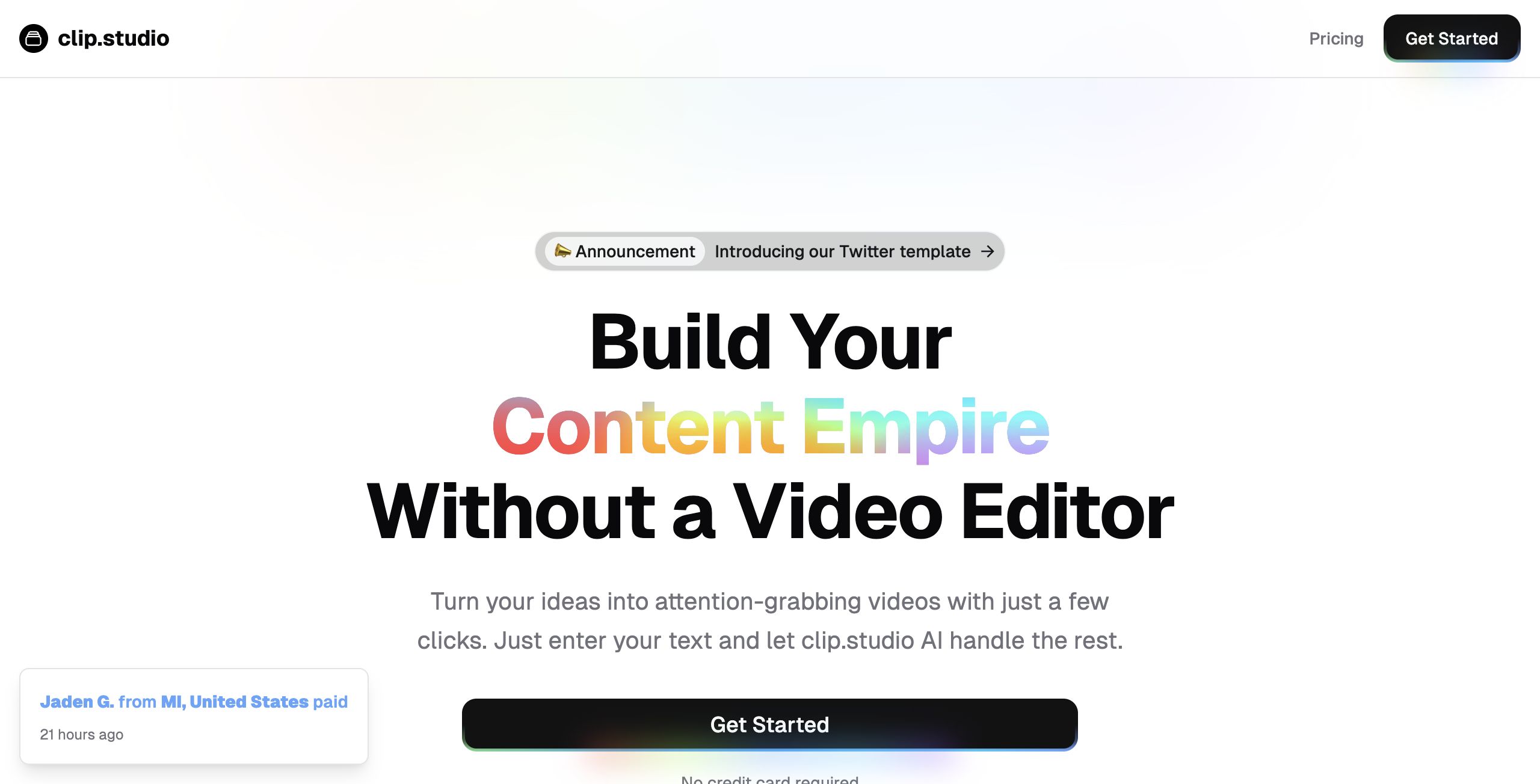 Clip Studio encourages users to get started for free without requiring a credit card. This entry-level pricing structure makes it accessible for creators and businesses who want to experiment with AI-powered video creation without an upfront commitment. The free access, combined with the toolβs robust features, positions Clip Studio as a cost-effective solution compared to traditional video editing software and other complex platforms.