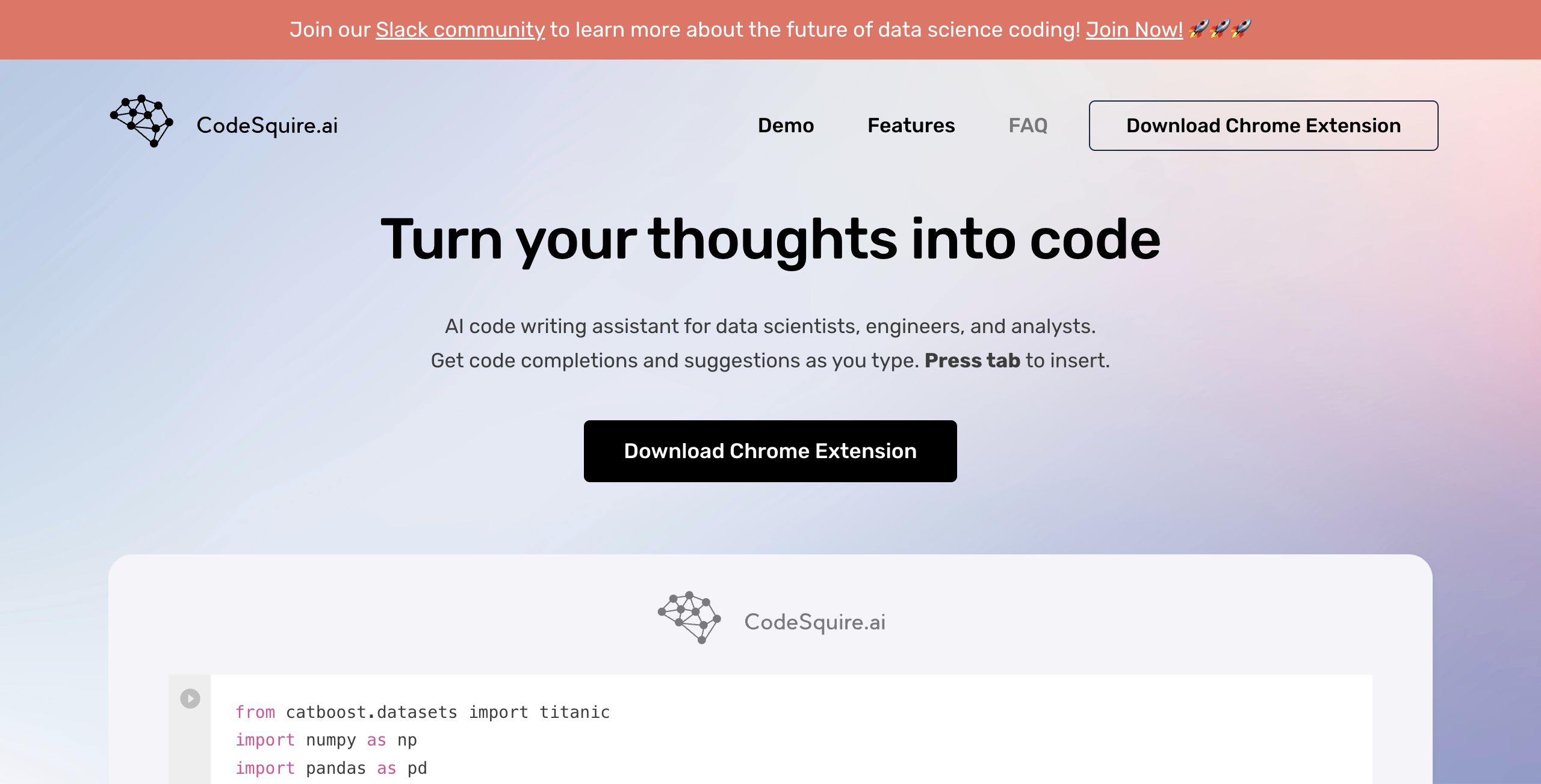 CodeSquire is an AI-powered code writing assistant primarily designed for data scientists, engineers, and analysts. The tool aims to streamline the coding process by offering real-time autocomplete suggestions, translating natural language comments into code, and helping users understand and build complex functions. With the rapid evolution of data science and the increasing reliance on efficient programming practices, CodeSquire emerges as a relevant review subject for professionals seeking to boost their productivity and reduce the friction of manual coding.