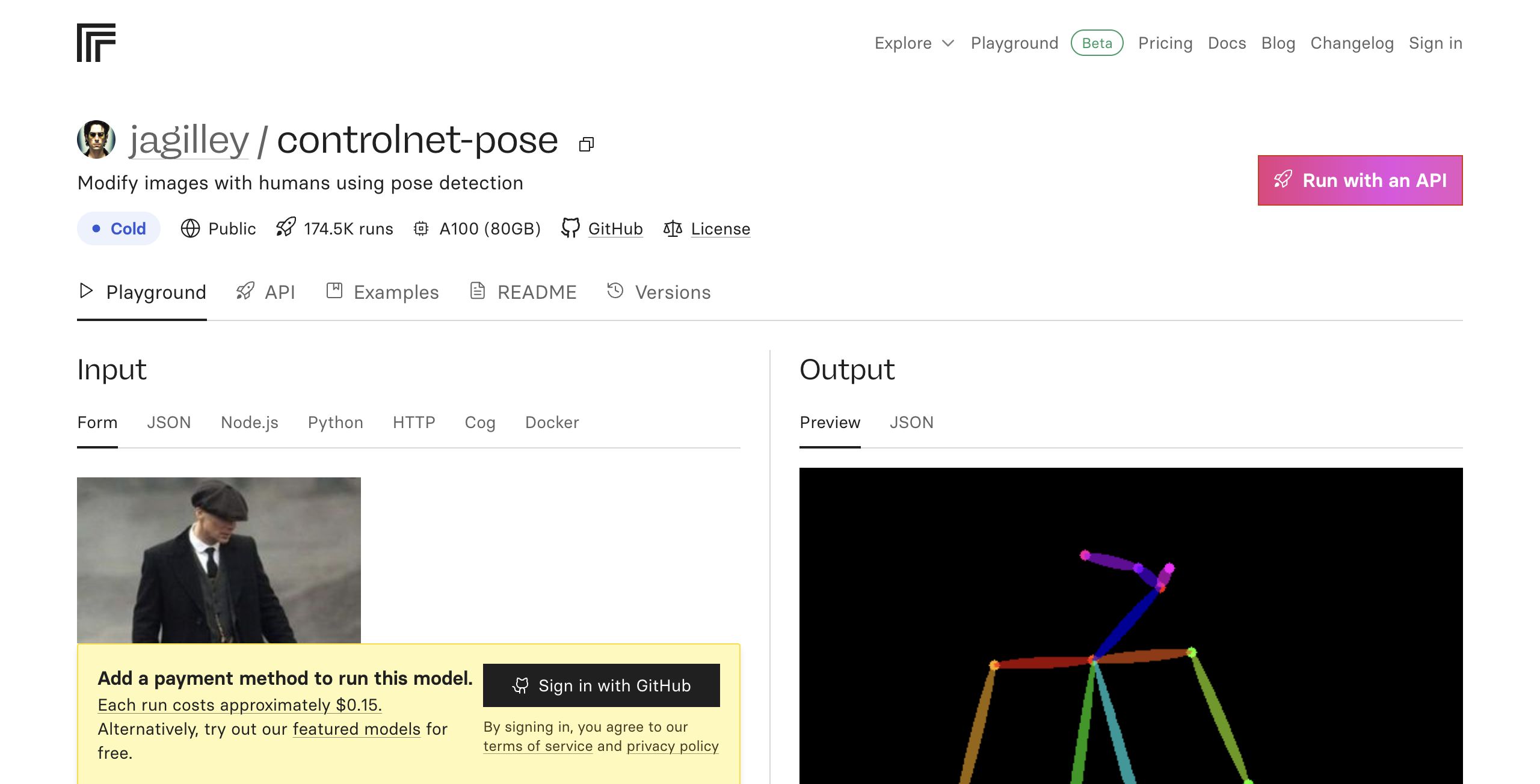 ControlNet Pose operates on a pay-per-run model, with each execution costing approximately $0.15. For budget-conscious users, this roughly translates to 6 runs per $1. Considering the level of customization and the integration options available (including the ability to run the model on personal hardware), the pricing structure offers good value, especially for professionals with frequent and varied image generation needs.