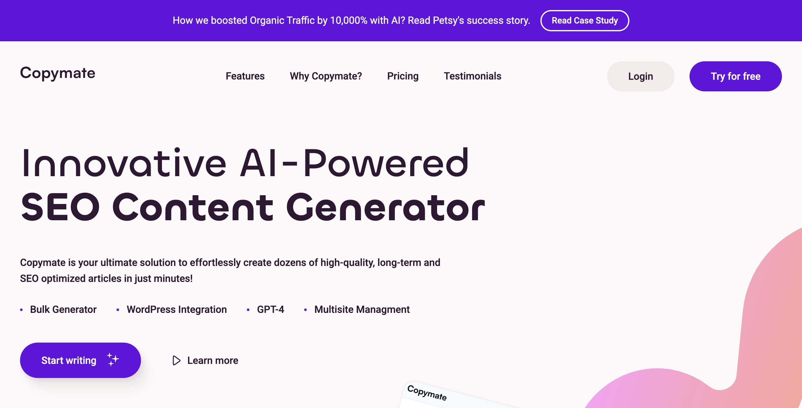 Copymate is an AI-powered SEO content generator designed to help marketers, SEO specialists, content creators, and website owners produce dozens of high-quality, long-term SEO-optimized articles in mere minutes. Its innovative approach combines advanced AI technology with practical features such as bulk article generation, WordPress integration, GPT-4 capabilities, multisite management, and multilingual content support. This review is particularly relevant in today’s fast-paced digital landscape, where content quality and quick turnaround are crucial for boosting organic traffic and reducing content costs.