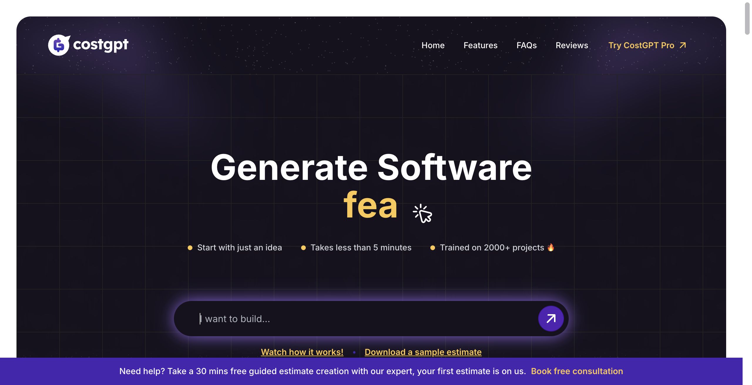 CostGPT AI is an innovative tool designed to enhance software project planning by transforming brief project descriptions into comprehensive plans, precise cost estimates, and realistic timelines. This AI-driven solution caters to project managers, developers, and business owners seeking to streamline the planning process. By inputting a concise project overview, users can quickly generate detailed roadmaps that encompass feature breakdowns, sitemaps, user stories, and critical milestones.