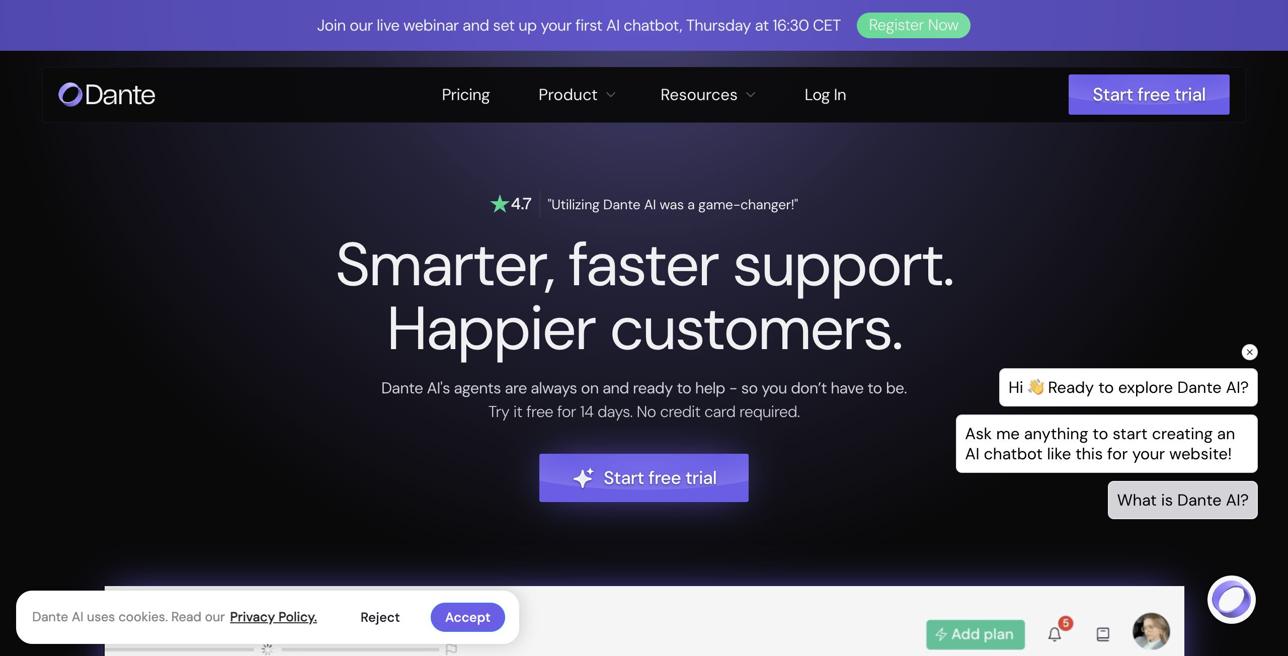 Dante AI offers a 14-day free trial with no credit card requirement, allowing users to explore its features before committing financially. While specific pricing details were not provided, the presence of a free trial suggests a subscription-based model. The value of Dante AI lies in its comprehensive feature set and ease of use, making it a cost-effective choice for businesses seeking to enhance customer engagement through AI technology.