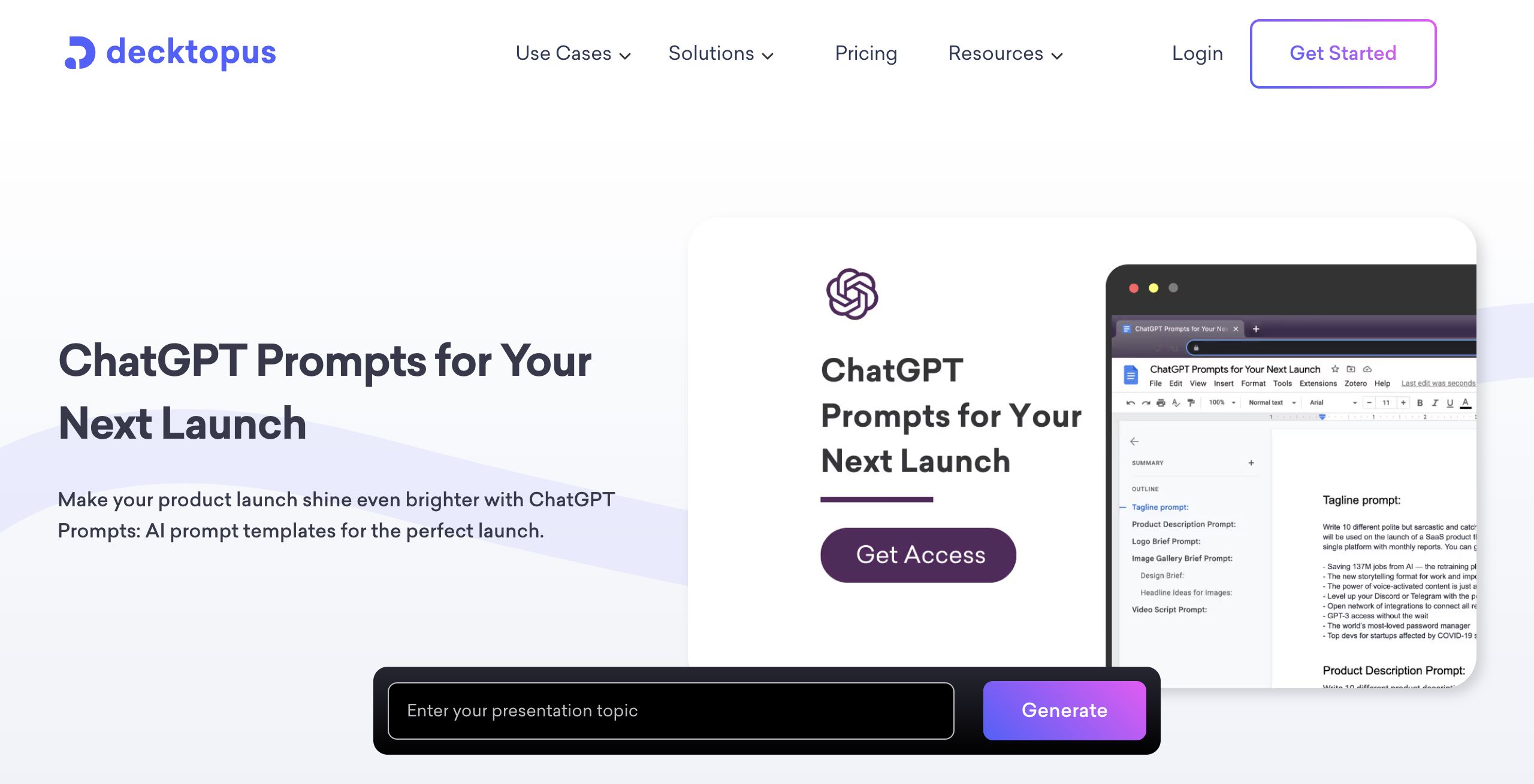 Key functionalities of Decktopus include the ability to create a cohesive story around your product, establish a distinctive voice, and highlight essential features and benefits. This makes it an invaluable resource for marketers, entrepreneurs, and content creators seeking to enhance their launch strategies.