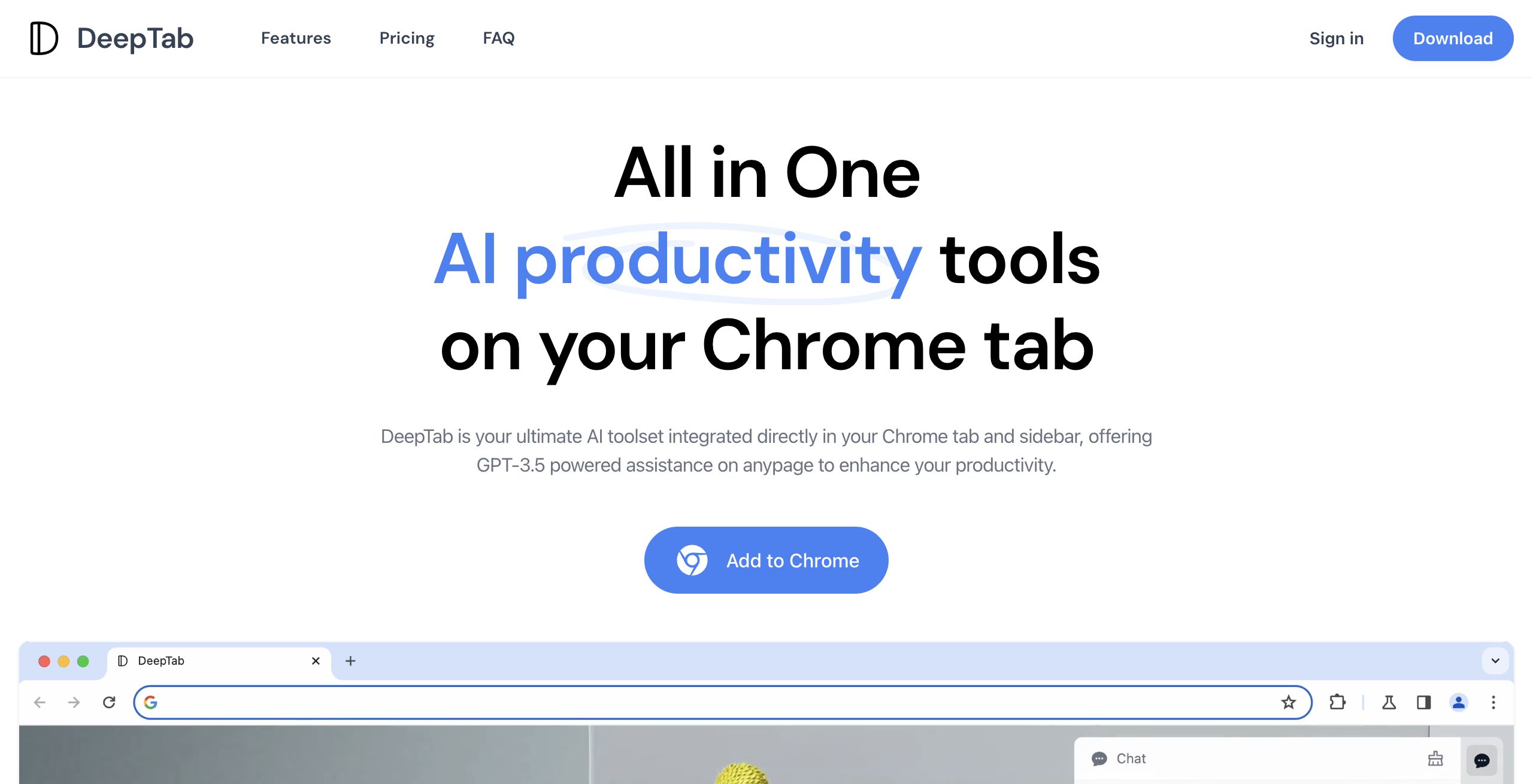 DeepTab is a Google Chrome extension designed to integrate an all-in-one suite of AI productivity tools directly into the browser. Built for anyone looking to enhance their online experience, DeepTab brings OpenAIβs GPT-3.5 powered assistance to your new tab page and sidebar. This review examines how DeepTab can transform your browsing routine by providing AI-enhanced productivity features, making it a noteworthy option for users who spend a lot of time in their web browser.