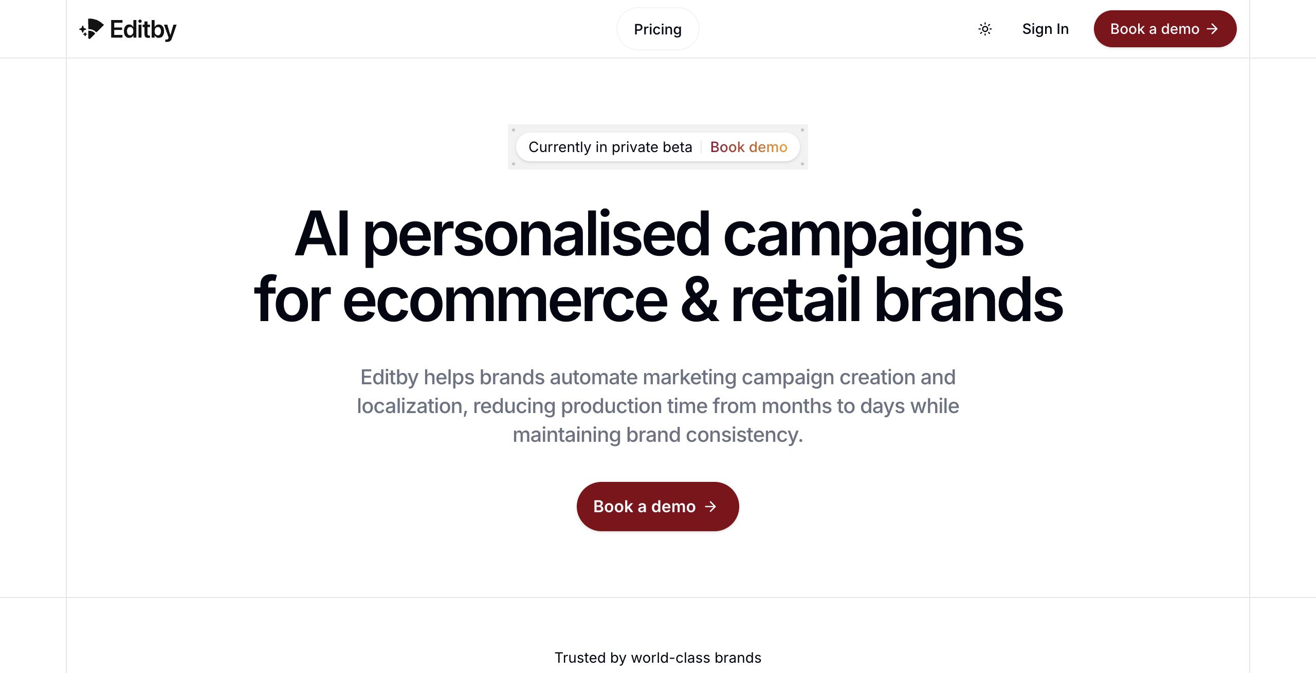 Editby is an innovative AI-driven platform designed to empower content creators and social media influencers, as well as marketing leaders in the ecommerce and retail sectors. The software aims to increase online presence and streamline the creation of personalized marketing campaigns while maintaining brand consistency. Given the growing need for efficient, automated content generation and the challenges associated with scaling personalized campaigns, Editby’s solution is both timely and relevant to today's digital landscape.