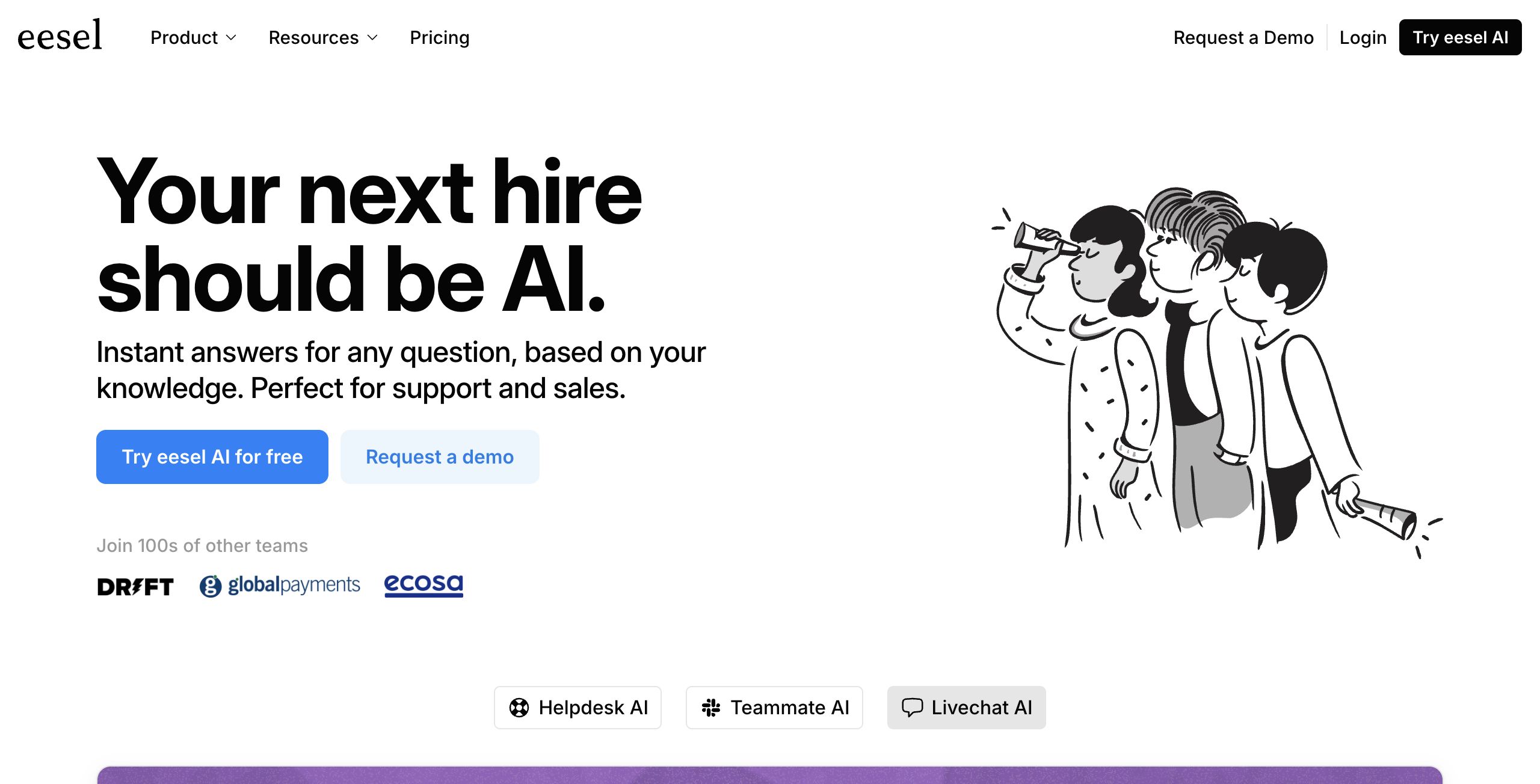 - Multiple Use Cases: Whether it’s for a helpdesk, live chat on a website, or a team assistant available within Slack and Teams, eesel AI adapts to various business scenarios with specialized modes such as Helpdesk AI, Teammate AI, and Livechat AI.