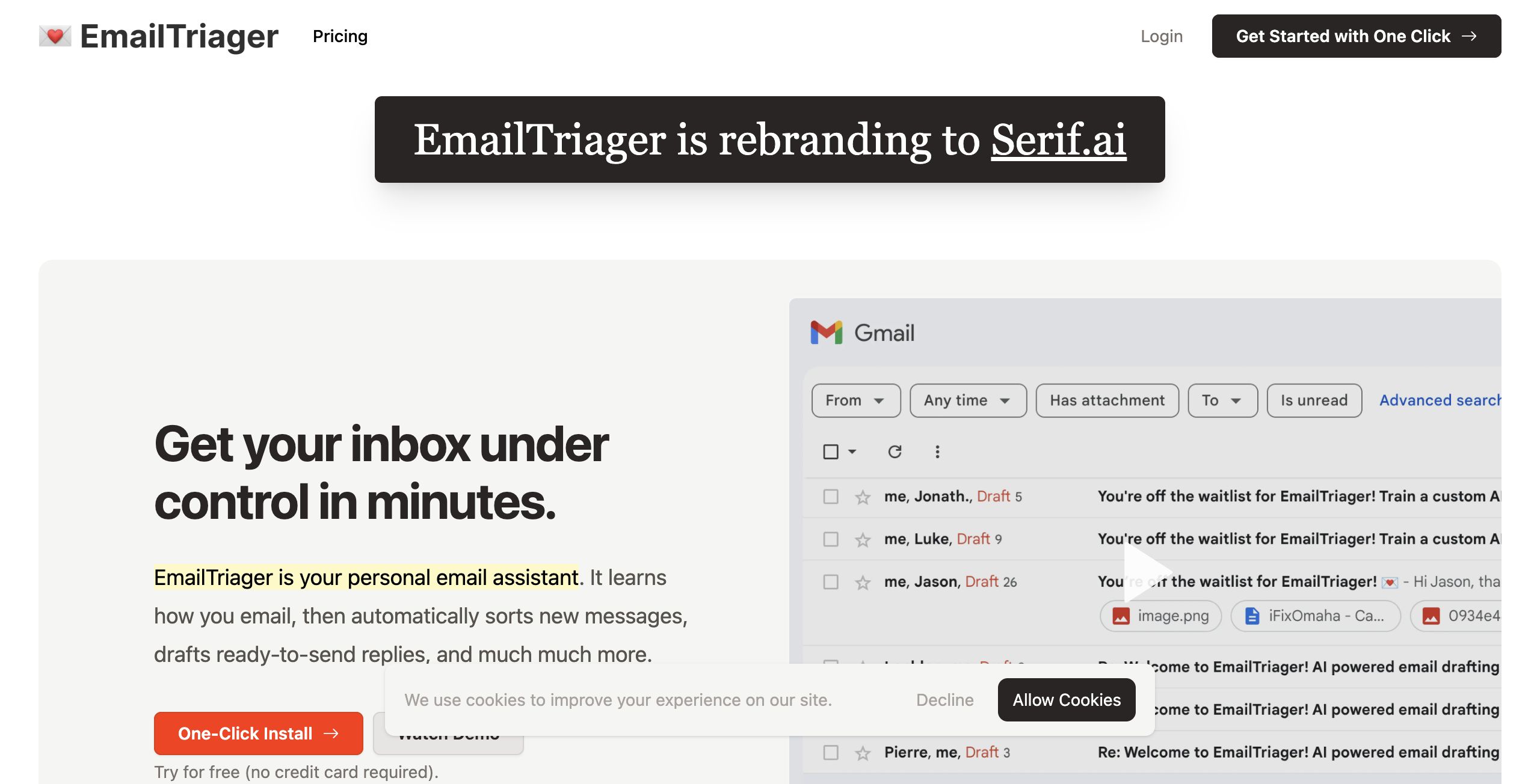 EmailTriager (soon to be rebranded as Serif.ai) is an AI-powered email assistant designed to help users manage their inbox more efficiently. Its primary purpose is to automatically generate draft replies to emails in the background, saving time and reducing the mental load associated with managing a busy inbox. This review is relevant for professionals and anyone overwhelmed by email traffic, looking for a seamless and natural integration with Gmail without the hassle of installing complex software or extensions.