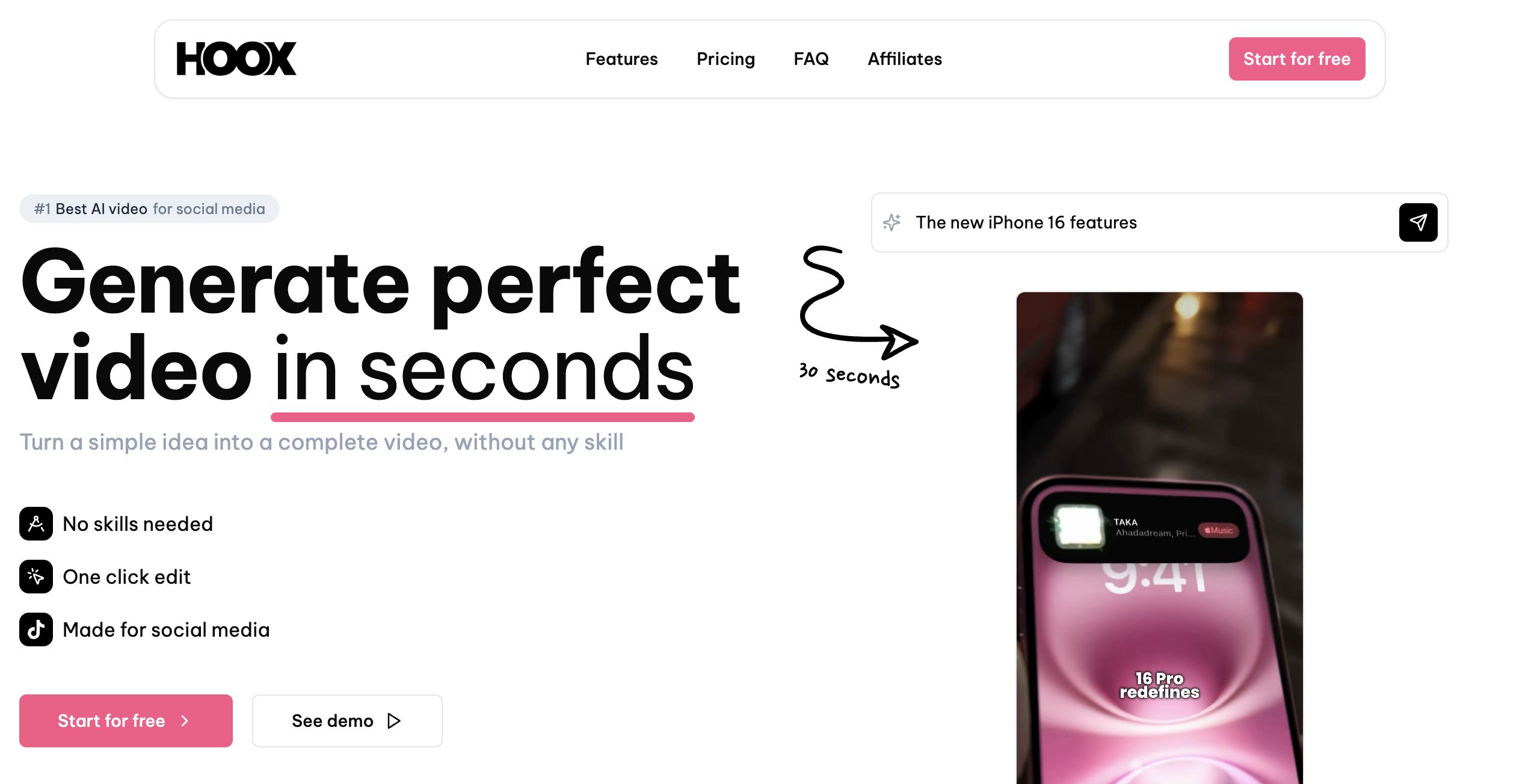 Hoox is an AI-powered video creation tool designed for marketers, content creators, small business owners, and social media enthusiasts. Its primary purpose is to simplify the video production process by automating the creation of professional-looking videos from just a simple idea. In todayβs fast-paced digital world, engaging video content is essential, and Hoox offers a quick, efficient solution for those looking to enhance their online presence without the need for advanced editing skills.