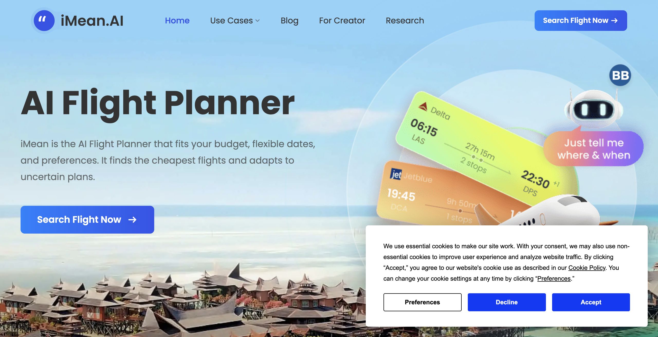 iMean.AI is an AI-powered platform designed to automate flight searches and comparisons, making it easier for travelers to find the best deals available. Developed for both leisure and business travelers who want a quick and efficient way to plan their journeys, iMean.AI eliminates the need for laborious manual searches by scanning multiple flight platforms in real time. This review is relevant as it highlights how AI-driven solutions are transforming travel planning by offering personalized, cost-effective options for finding flights.