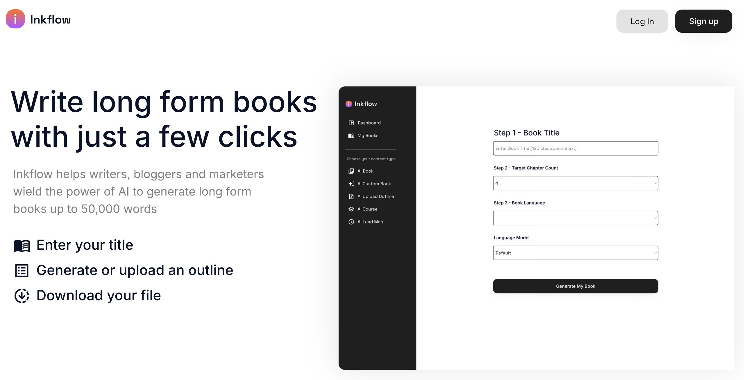 Inkflow.io is an AI-powered book writing tool designed specifically for individuals aiming to generate structured non-fiction book manuscripts quickly and efficiently. Whether you’re a self-employed professional, media producer, blogger, or a marketing agency professional, Inkflow.io streamlines the writing process by automating the creation of long-form books with minimal effort.