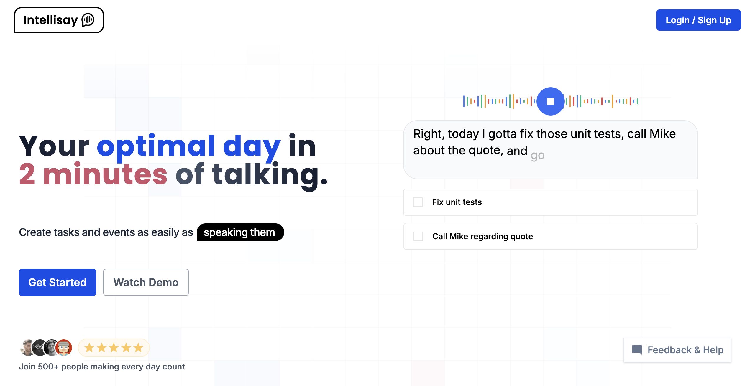Intellisay is an innovative voice-activated productivity tool that transforms spoken tasks into a well-organized daily schedule. Designed for seamless user interaction, Intellisay employs advanced AI technology to accurately transcribe and interpret verbal instructions, enabling users to effortlessly manage their daily commitments. This tool not only captures tasks and events but also intelligently organizes them into an optimized schedule, ensuring that users can prioritize effectively.