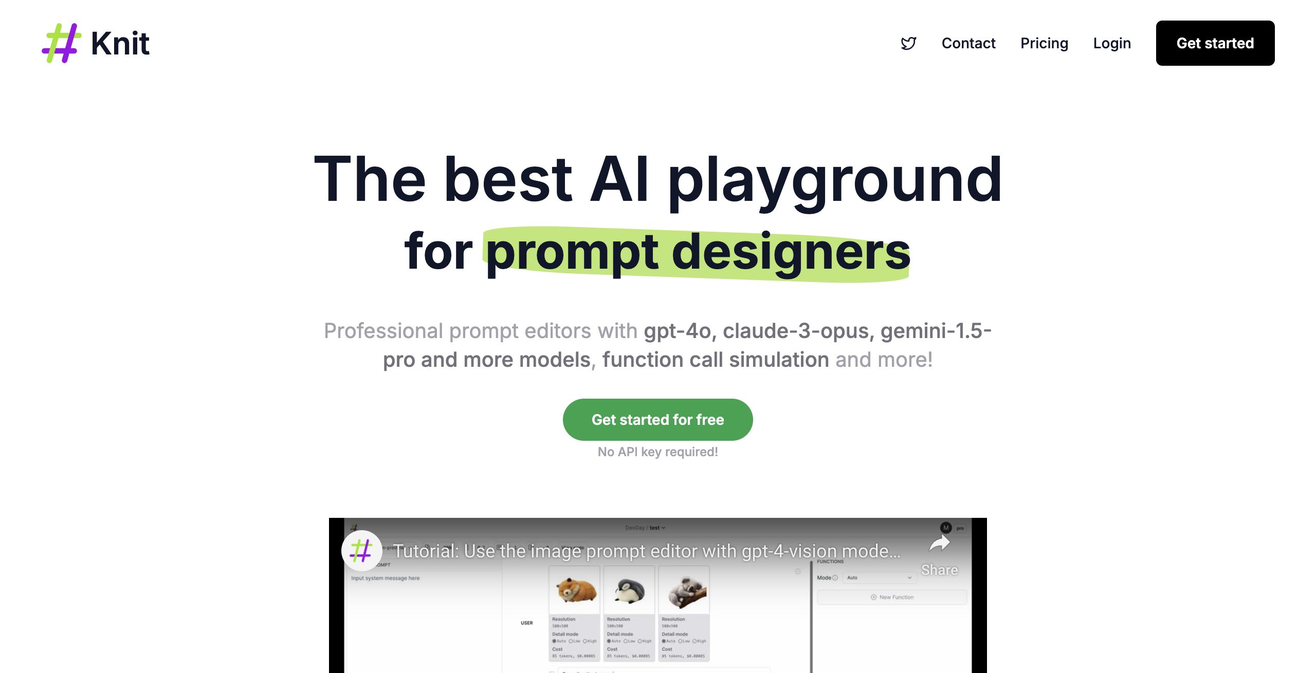 Knit is a free, collaborative AI prompt management platform designed for prompt designers and teams. It enables users to build, store, edit, and run prompts, making it an ideal playground for professionals seeking to iterate and tinker with prompt designs in a team environment. With its focus on collaboration, version control, and security, Knit is especially relevant for teams who manage complex prompt workflows or rely on diverse AI models.