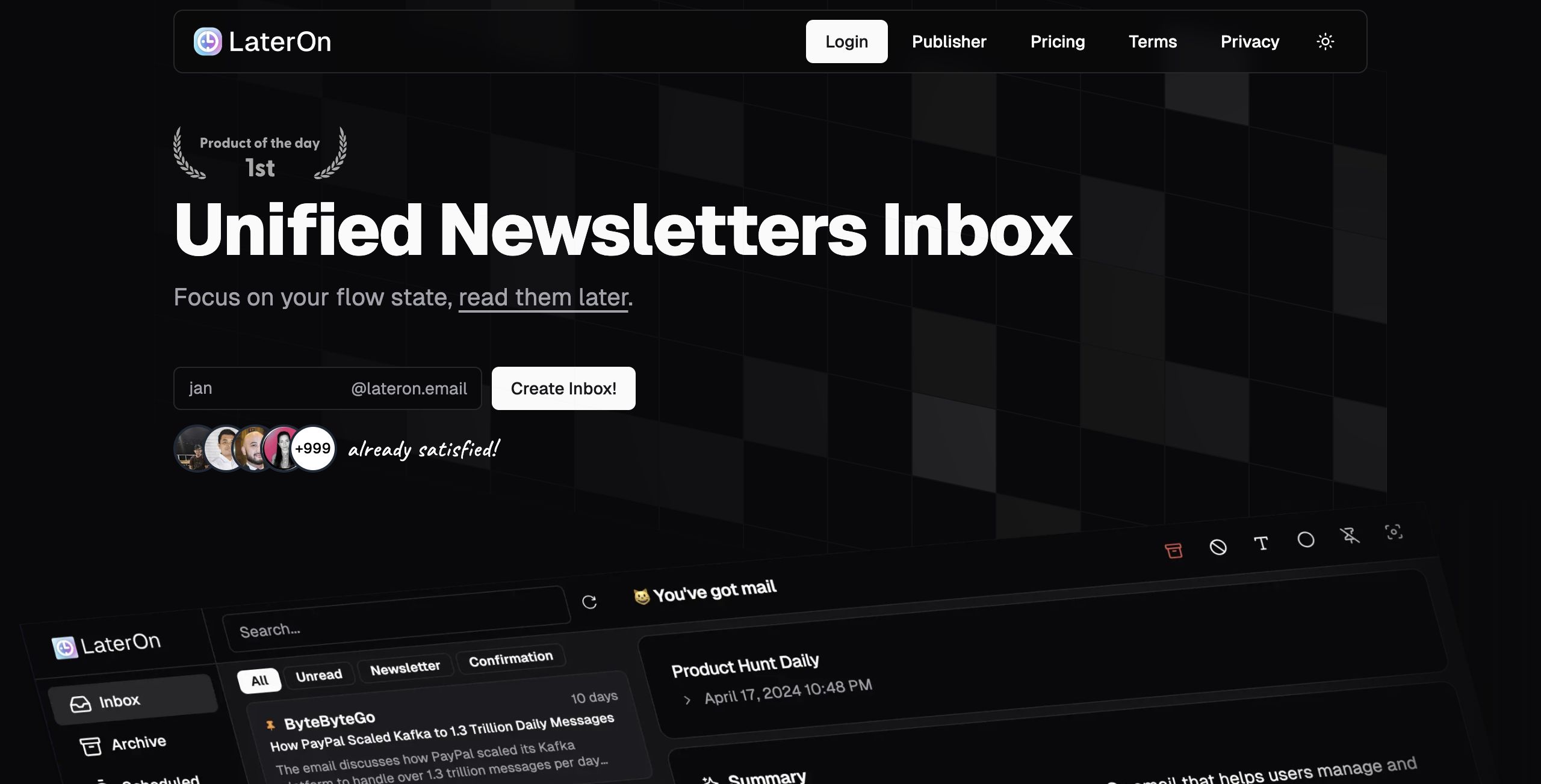 LaterOn is an innovative tool designed to aggregate and summarize newsletters into a single, consolidated email. Aimed at individuals who want to manage their newsletter subscriptions without cluttering their inboxes, LaterOn allows users to subscribe to multiple newsletters using a @lateron.email address. This tool is particularly relevant in today's digital age where email overload is a common issue, offering a streamlined solution for newsletter consumption.