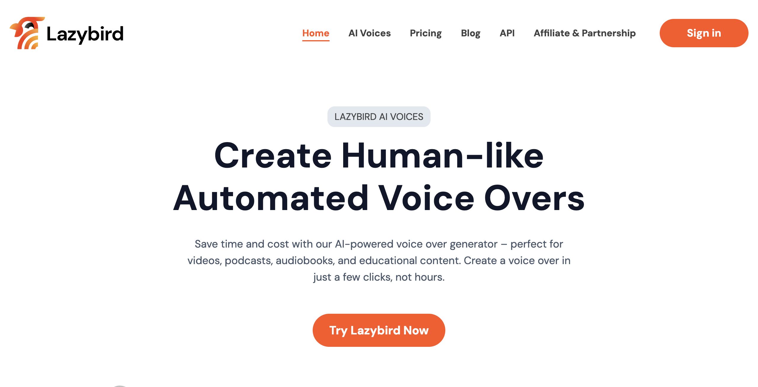Lazybird is an advanced AI-driven voice over generator that enables users to produce high-quality, human-like voiceovers for a variety of multimedia applications. Perfect for videos, podcasts, audiobooks, TikTok clips, educational materials, and even phone systems, Lazybird streamlines the voice production process, allowing creators to save valuable time and resources.