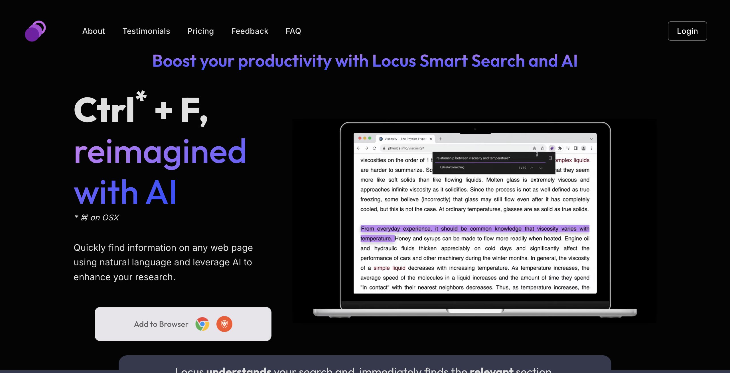 Locus Extension is an AI-powered Chrome extension designed to enhance web content search, summarization, and research. It transforms the traditional CTRL+F functionality by integrating natural language processing, making it easier for students, researchers, professionals, and anyone dealing with large volumes of online information to quickly locate relevant details and synthesize data. In todayβs fast-paced digital environment, where effective information management is key, Locus Extension offers an innovative solution to boost productivity and streamline research tasks.