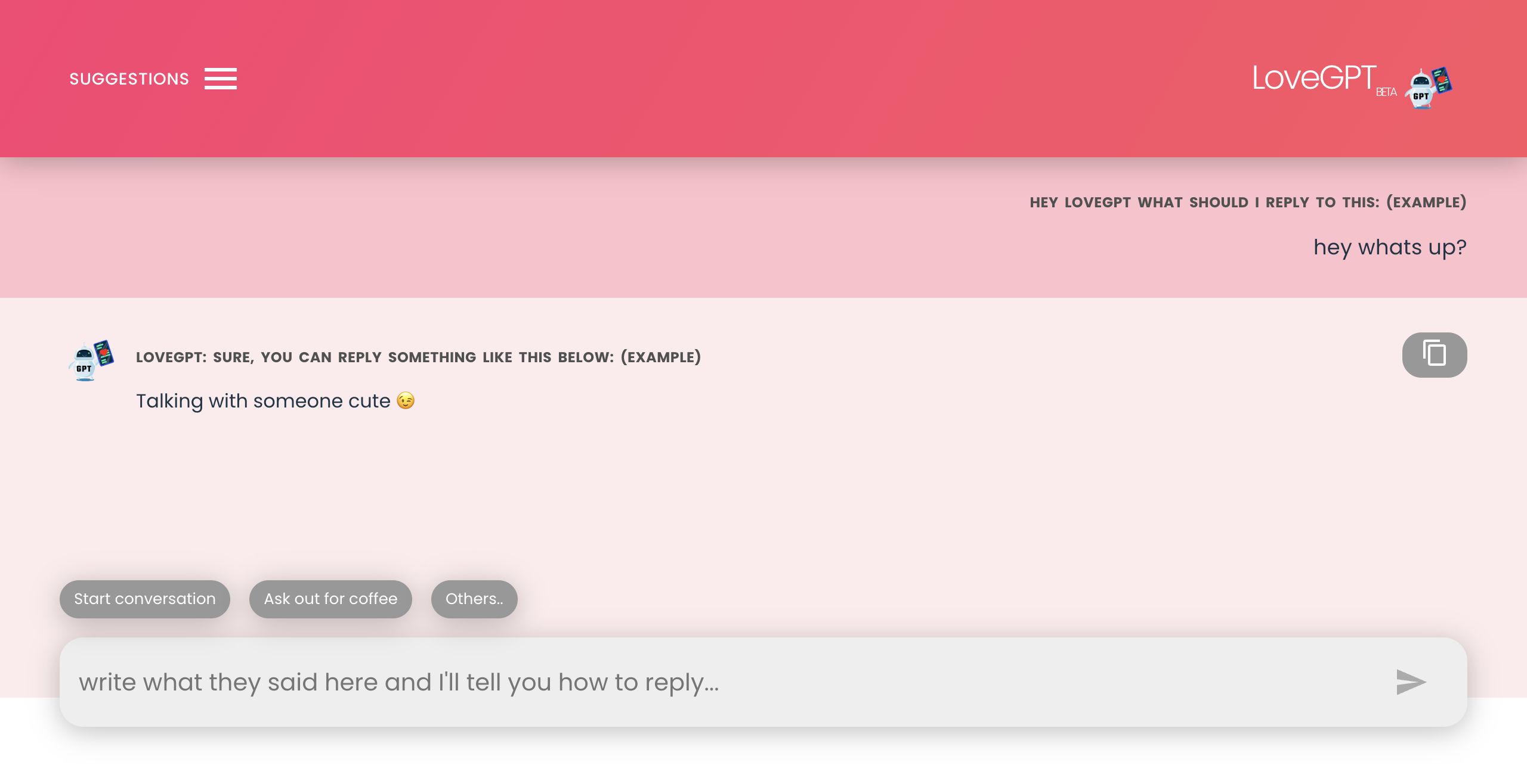 - Diverse Conversation Starters: Whether itβs initiating a casual chat or crafting an invitation for coffee, LoveGPTBETA offers various approaches to keep the dialogue fresh and engaging.