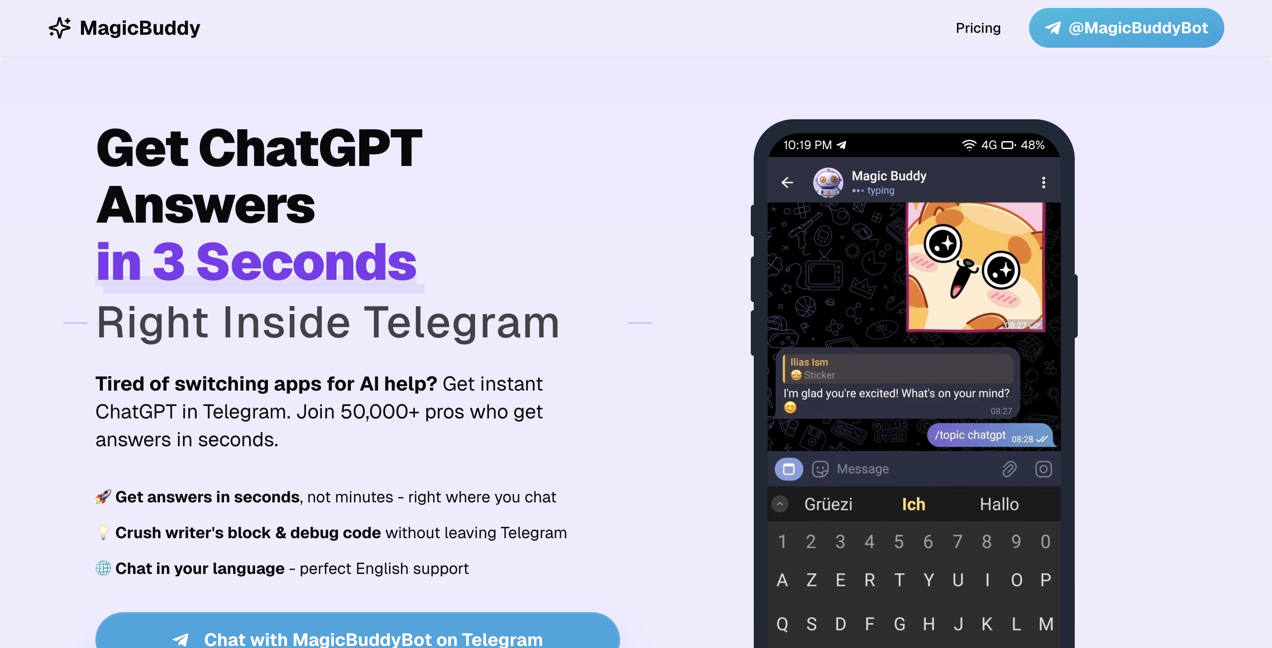 MagicBuddy is a Telegram Bot designed to bring the power of ChatGPT directly to your messaging experience. Built for anyone who wants quick, engaging, and intelligent responses—from casual users seeking conversation, to professionals needing help with studies, coding, or creative writing—MagicBuddy offers a seamless way to interact with advanced AI without leaving Telegram. This review examines its key features, pricing structure, and overall value, making it highly relevant in today’s fast-paced digital communication landscape.