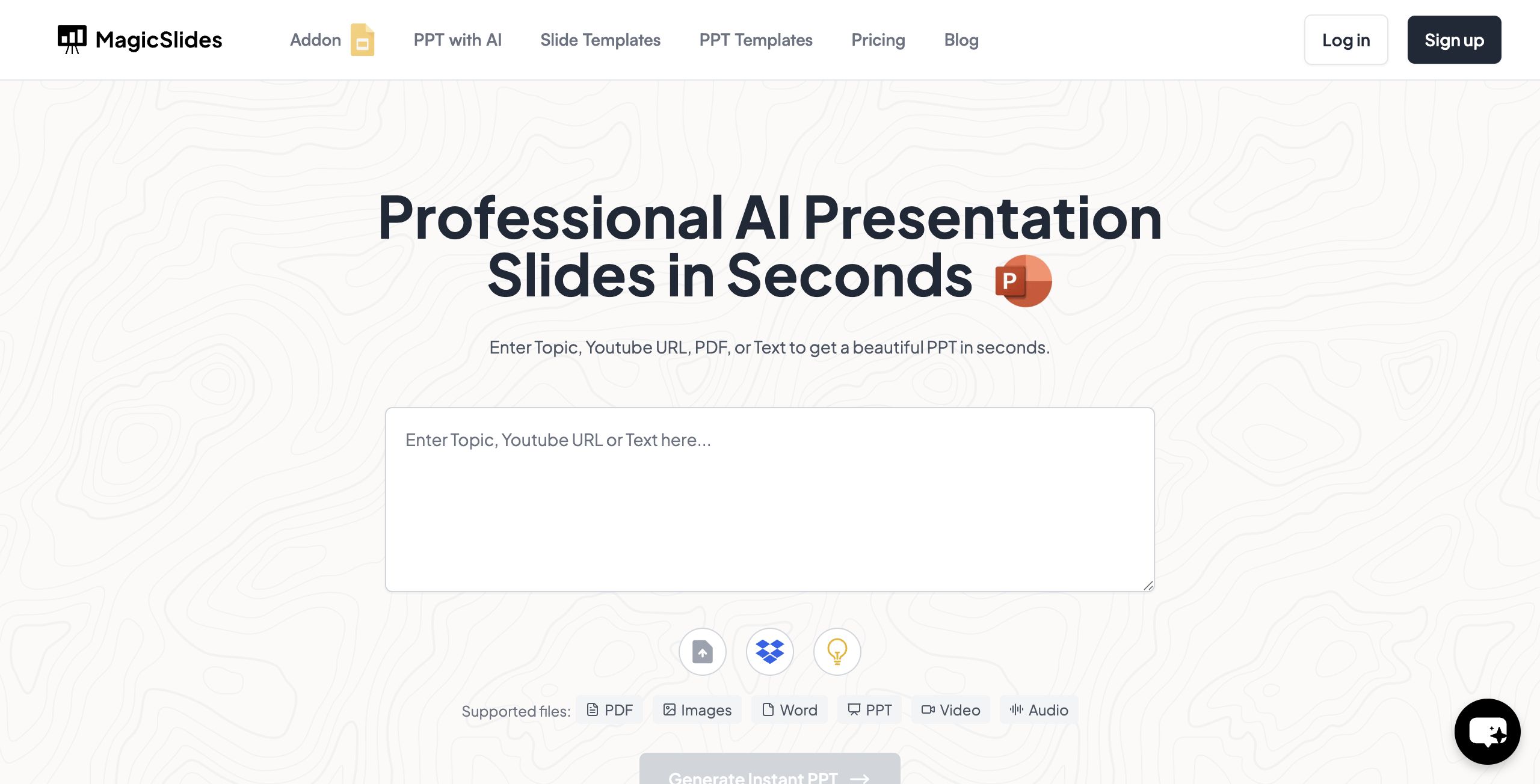 - Multiple Input Sources: Users can generate slides by simply entering a topic, pasting text, or uploading files such as PDF, Docx, images, and even YouTube videos.