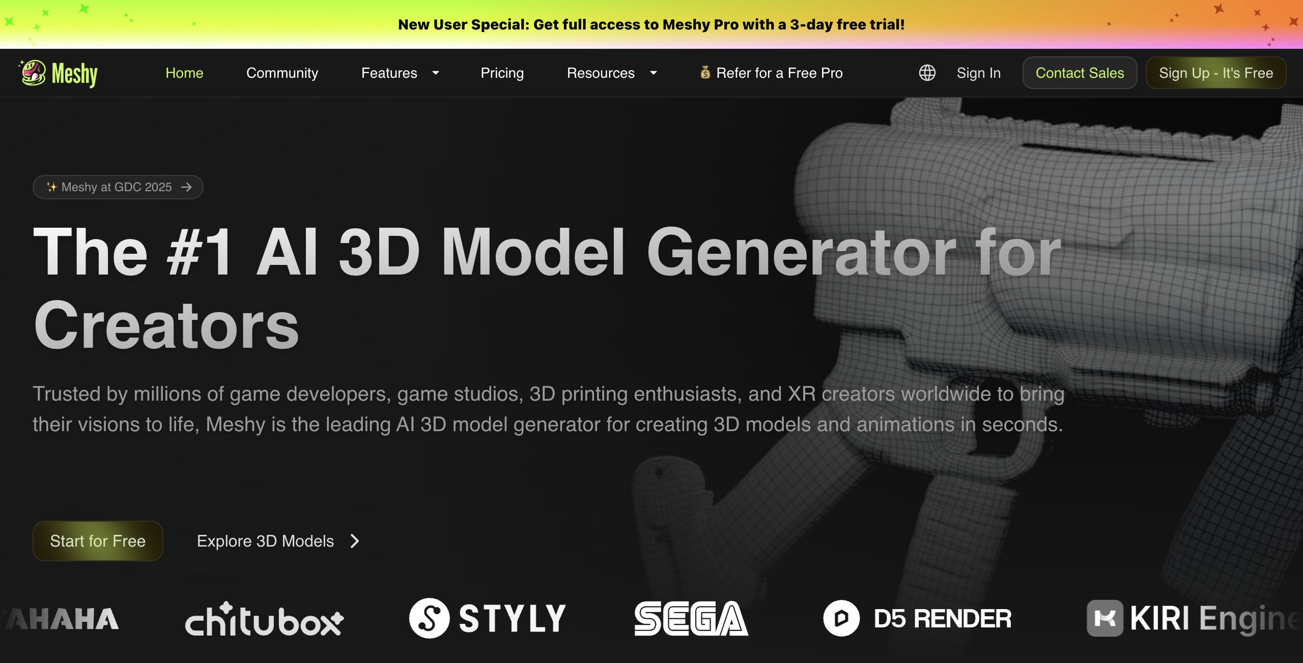 Meshy AI presents an attractive pricing structure for newcomers. The platform prominently offers a 3-day free trial of its Meshy Pro version, allowing users to experience its full range of features at no immediate cost. Additionally, terms like “Sign Up - It’s Free” signal a low entry barrier, making Meshy AI accessible to hobbyists as well as professionals who desire a cost-effective yet powerful solution for 3D model generation. This trial-based and freemium approach contributes to excellent value compared to traditional 3D modeling tools.