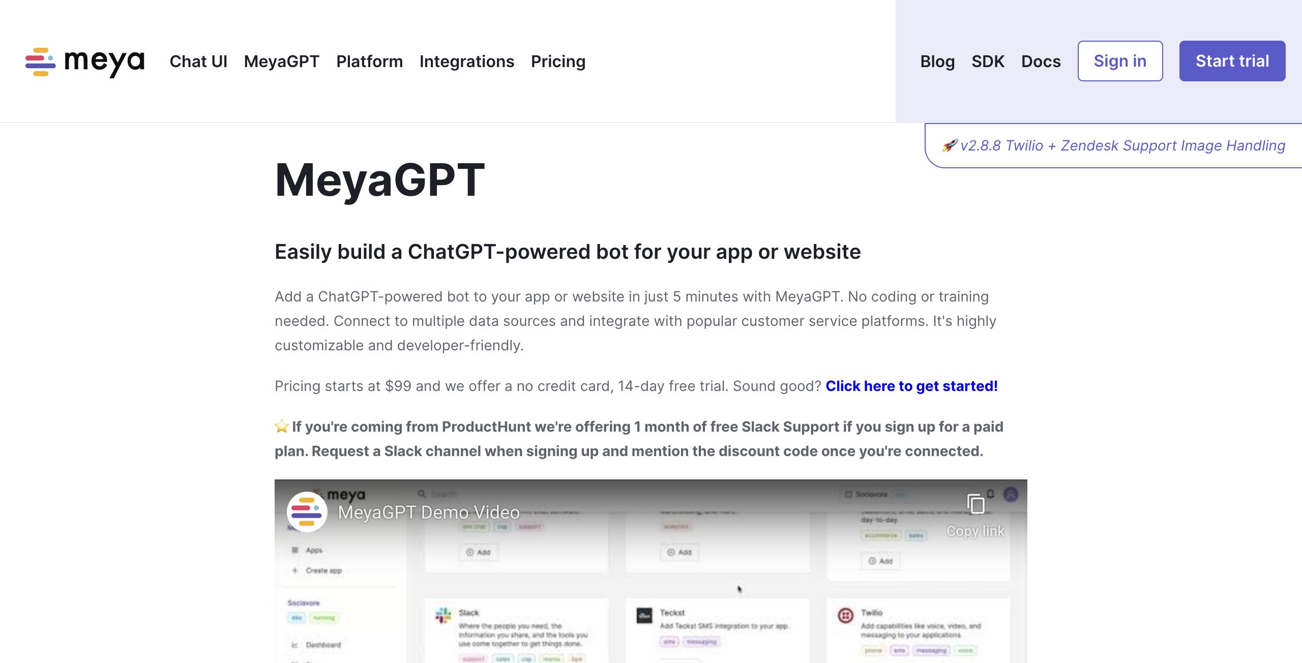 MeyaGPT offers a straightforward pricing model that starts at $99, complemented by a 14-day free trial which does not require a credit card. Additionally, a special promotion provides one month of free Slack support for ProductHunt users who sign up for a paid plan. Given its extensive feature set, robust integrations, and ease of use, MeyaGPT represents competitive value, making it a strong proposition for companies seeking a reliable chatbot solution.