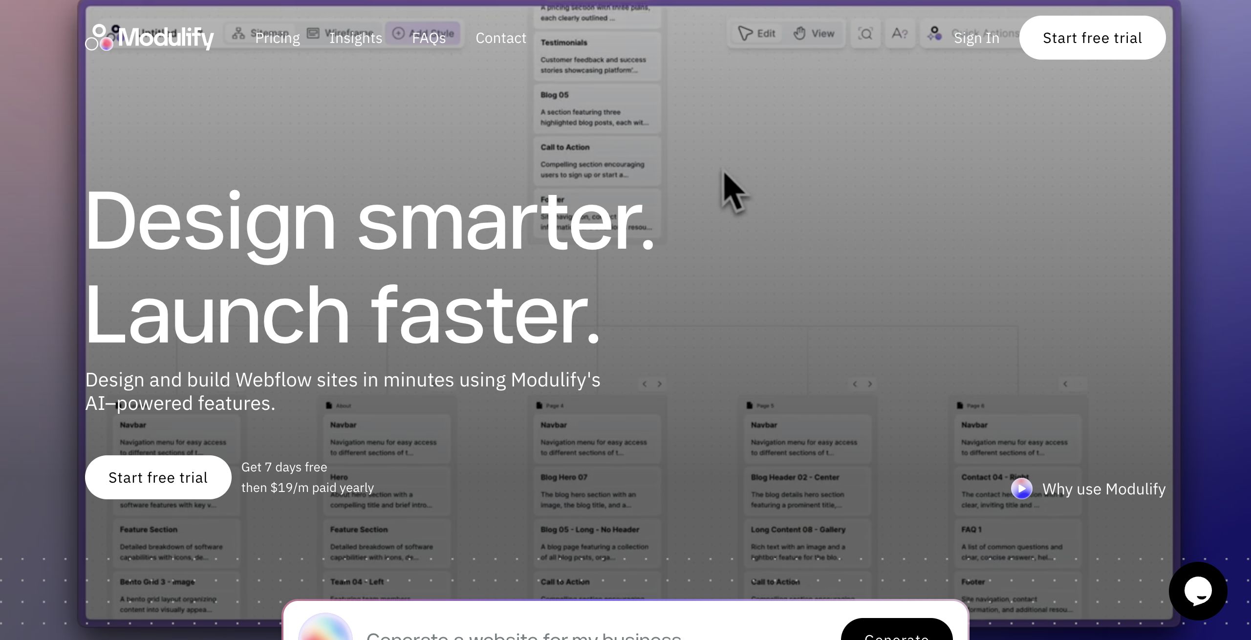 Modulify AI offers a clear pricing structure that enhances its appeal. Users can start with a 7-day free trial, which allows them to explore the platform's features without any upfront commitment. After the trial period, the service is priced at $19 per month when billed annually. This subscription-based pricing model, combined with the tool's efficient features, offers good value for those looking to quickly design and deploy professional Webflow sites.
