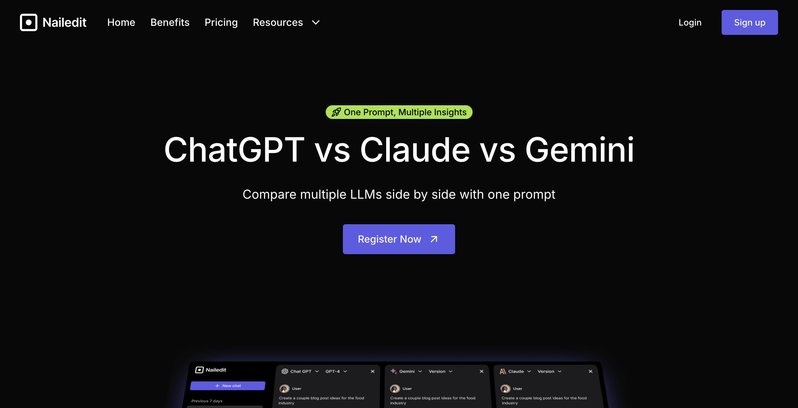 Nailedit.ai is an innovative platform designed to facilitate the comparison of outputs from various large language models (LLMs) such as ChatGPT, Claude, and Gemini, all triggered by a single prompt. This tool simplifies the evaluation process by enabling users to view AI-generated responses side-by-side, enhancing both the efficiency and effectiveness of content generation. Key features include instant comparisons, which eliminate the need for users to switch between different models, thereby saving valuable time and effort. Nailedit.ai is particularly beneficial for content creators, researchers, and professionals seeking diverse perspectives or optimal responses from AI. By streamlining the workflow, users can focus on refining their ideas and enhancing their projects without the burden of crafting individual prompts for each model. The unique capability to draw insights from multiple LLMs in one place not only drives innovation but also ensures that users access the best possible information, making Nailedit.ai an essential tool for anyone looking to leverage AI in their work.