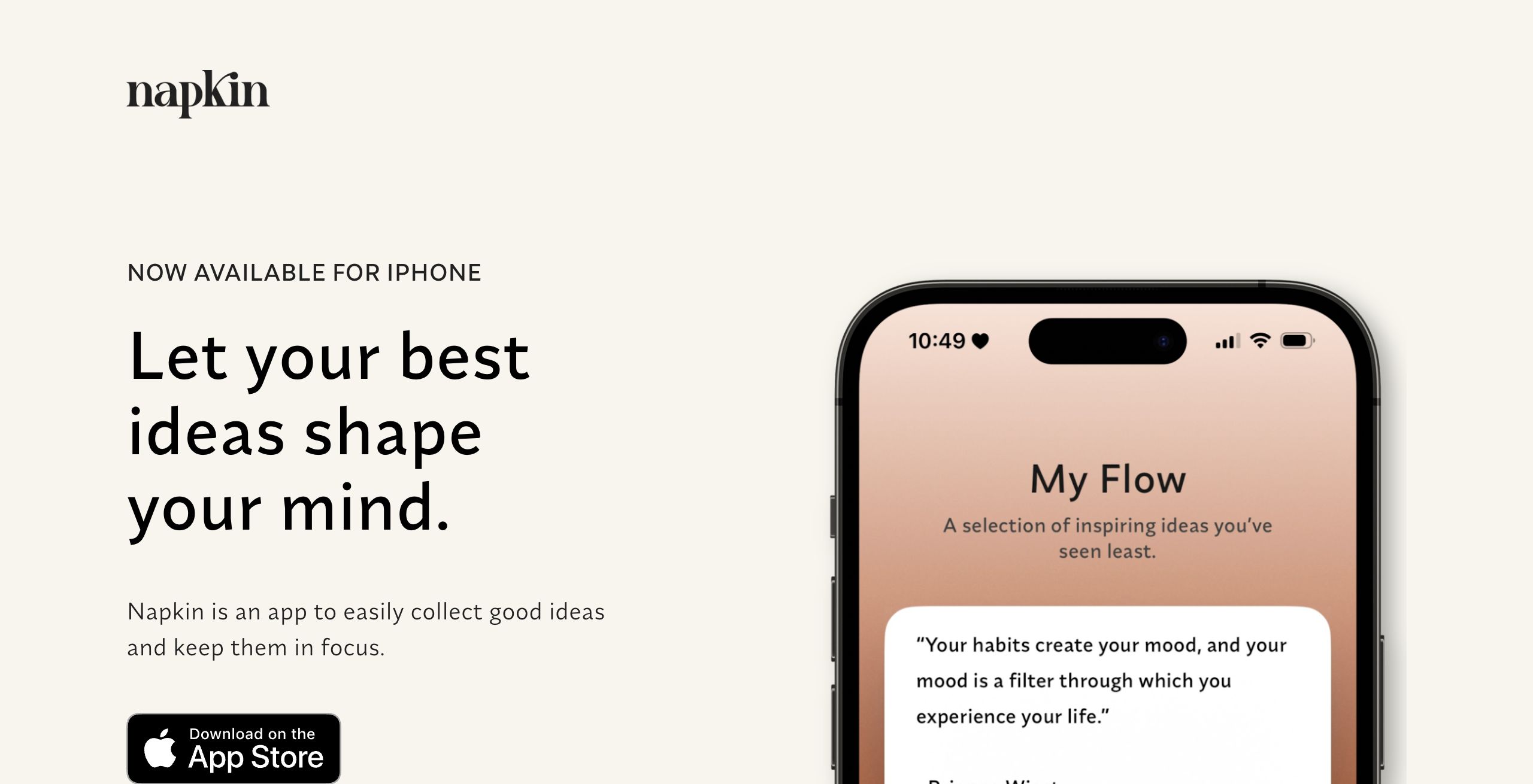 Napkin is a dedicated tool for collecting and organizing ideas, designed for creative thinkers, writers, and anyone who values reflection and inspiration. It offers a simple and distraction-free environment where users can capture memorable quotes, thoughts, and insights on the go. In todayโs world, where digital distractions are rampant, Napkin provides a calm space to foster personal growth by helping you curate and connect your best ideas.