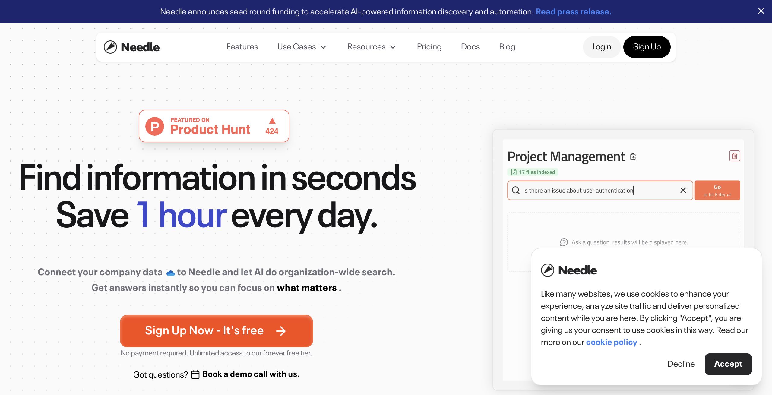 - Enterprise-Ready AI Search: Needle enables users to quickly access and reference information from connected data sources, eliminating manual searches and reducing context-switching.