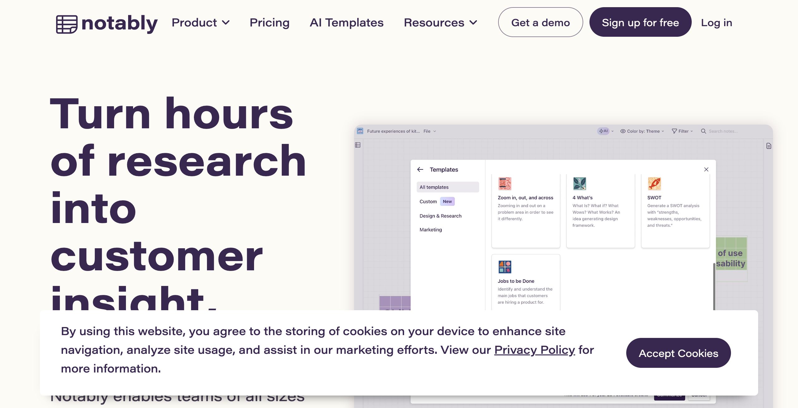 Notably is an advanced AI-driven platform designed to elevate research data analysis and uncover actionable insights. By consolidating various functionalities, it empowers users with tools like a robust research repository, AI-supported research capabilities, and efficient video transcription services. The platform facilitates cluster analysis to identify patterns in data, while digital sticky notes enable intuitive organization of ideas and findings. Additionally, Notably offers customizable AI templates to streamline research processes.
