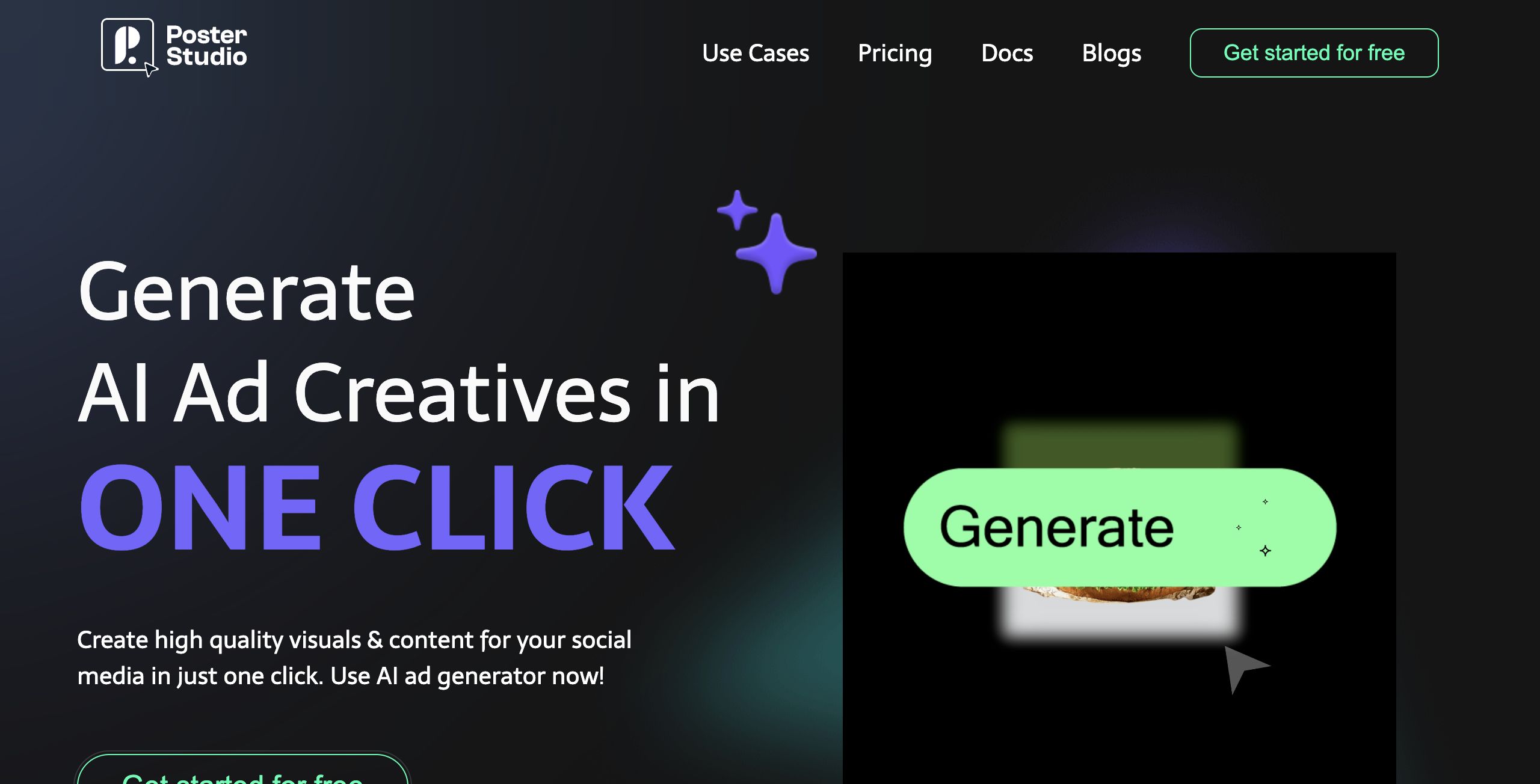 Poster Studio appears to offer a free start point, as evidenced by multiple "Get started for free" calls-to-action throughout the website. While detailed pricing structure specifics (such as subscription tiers or pay-per-download options) are not fully delineated, the service emphasizes a cost-effective approach by showcasing significant savings on creative production costs. This makes it an attractive proposition for both individual creators and agencies looking to scale design output without extensive investment in additional resources.