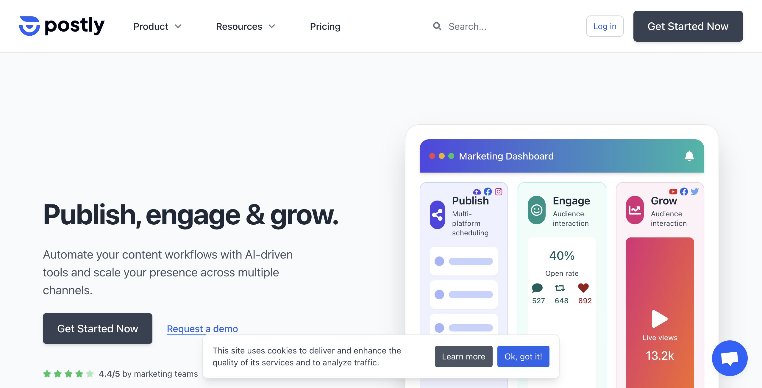 Postly is a comprehensive social media marketing platform designed to help agencies, marketers, and creators design and publish social media campaigns at scale. Leveraging AI-driven tools, the platform streamlines the creation, scheduling, and management of digital content. In todayβs fast-paced digital marketing environment, Postly stands out as a relevant solution for anyone looking to boost engagement, improve conversions, and manage marketing campaigns efficiently.