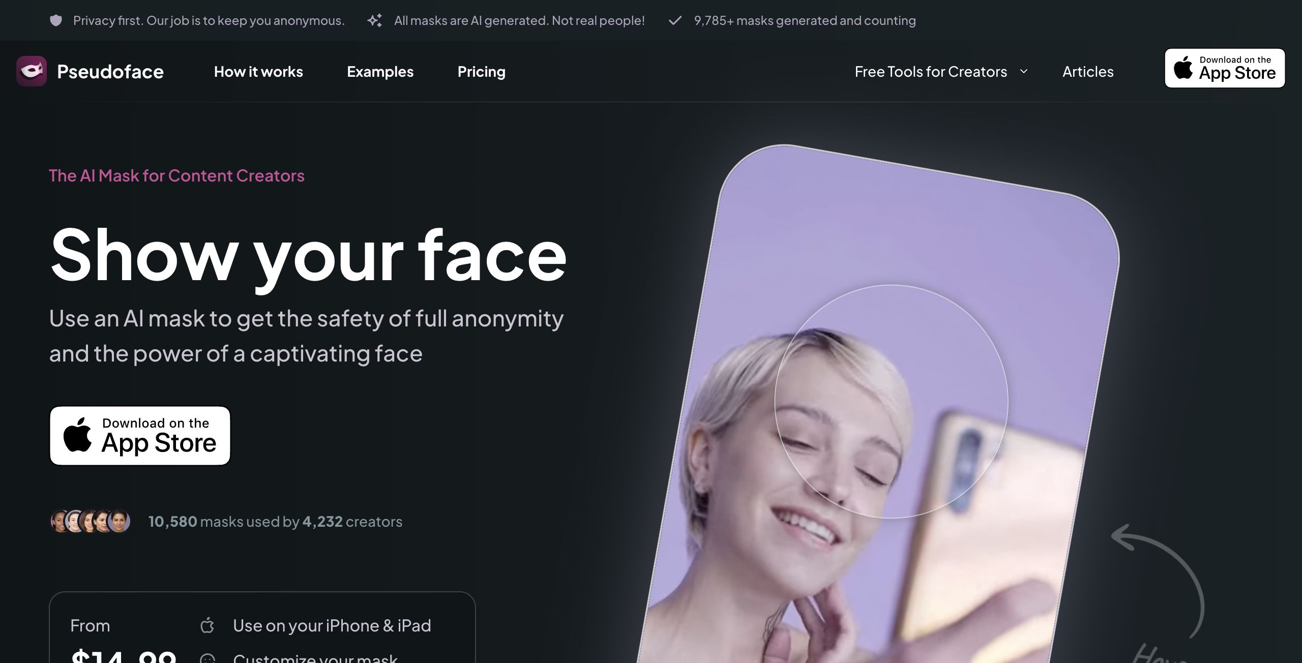 Pseudoface is an innovative app designed specifically for faceless creators who wish to maintain their privacy while engaging with their audience. Utilizing advanced AI technology, this tool generates customizable face filters that seamlessly adapt to individual facial features, ensuring anonymity without compromising creativity. Users can design an unlimited number of unique masks that are virtually indistinguishable from real faces, rendering them undetectable by both viewers and automated systems.