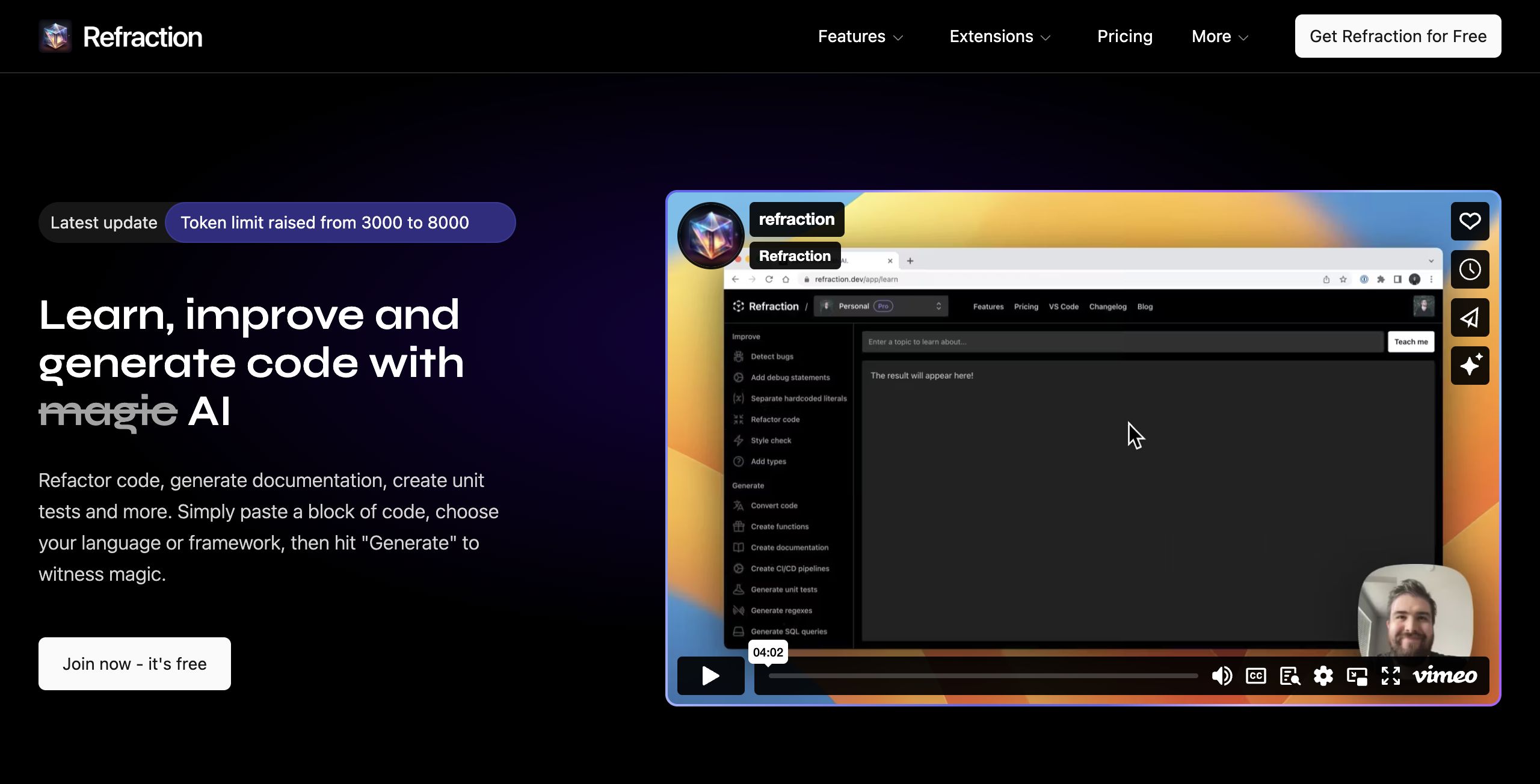 Overall, AIRefraction is a robust code generation tool that is well-suited for professional developers looking to automate tedious aspects of coding, such as generating unit tests, documentation, and refactoring code. Its extensive language support and ease of use make it a standout competitor in the field. While the free usage cap may prompt some users to upgrade sooner, the affordable subscription plan of $5 per month makes it an attractive option for teams and individual developers alike. Developers who require consistent and efficient automation in their coding practices will find AIRefraction to be a valuable addition to their toolkit, whereas those with sporadic coding demands might explore other alternatives before committing.