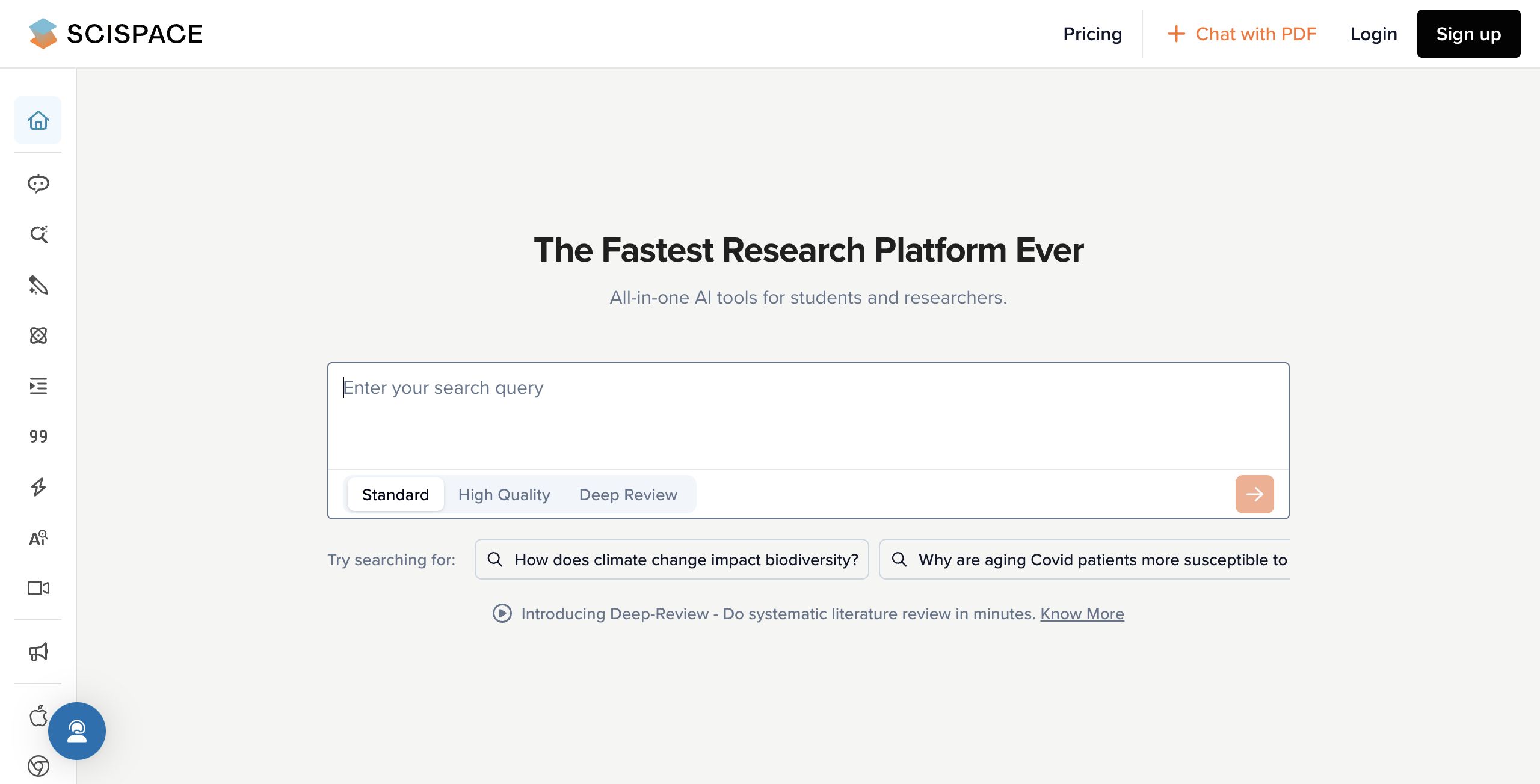 - All-in-One Research Platform: With additional applications like Chat with PDF and AI Writer, it caters to a broad spectrum of academic tasks—from systematic literature reviews to drafting new research content.