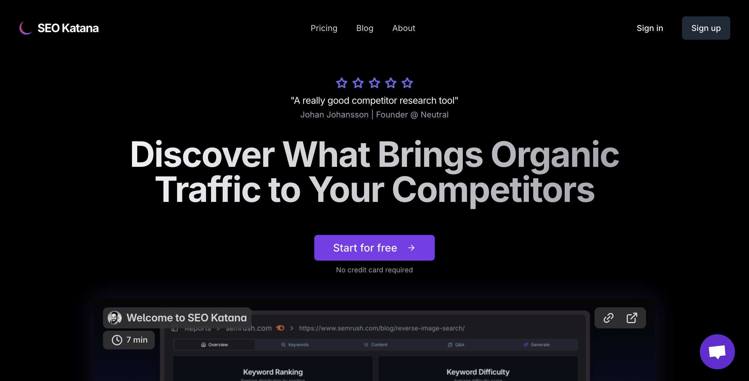 - Katana Plus ($30/month): Expands features with a competitors watchlist for up to 50 competitors and the capacity to generate up to 20 AI blog posts per month while retaining the full reports offered in the Starter plan.
