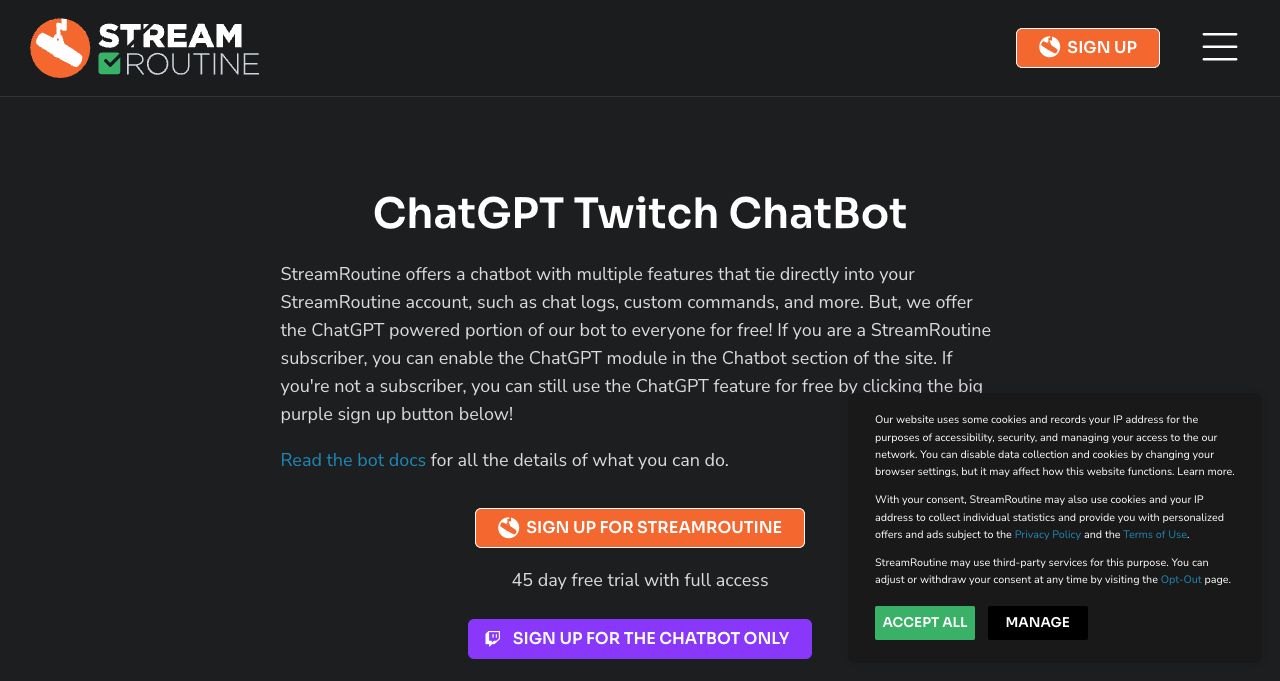 StreamRoutine adopts a flexible pricing strategy that caters to a range of users. The tool offers a 45-day free trial with full access, allowing streamers to experience all the premium features without commitment at the outset. Additionally, the ChatGPT-powered portion of the chatbot is available for free to all users, regardless of subscription status, providing an accessible entry point for new users. This dual approach, combining free features with a trial for full access, offers excellent value and flexibility for both casual and dedicated streamers.