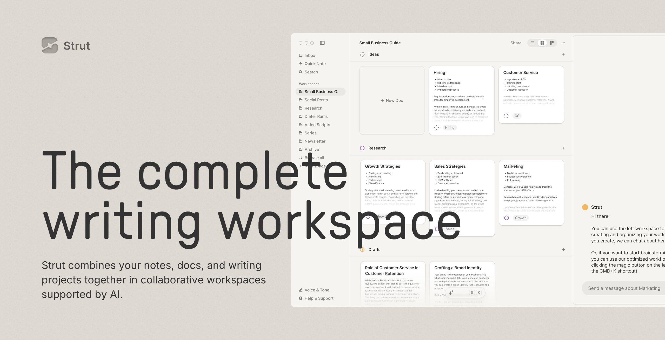 Strut is an AI-powered workspace specifically designed for writers who need to organize and collaborate on their projects. It caters to both individual writers and teams by offering a centralized platform that brings together notes, drafts, and documents to streamline the writing process. With the growing need for efficient project management and collaboration in today’s digital writing environment, Strut emerges as a relevant and timely solution for managing creative workflows.
