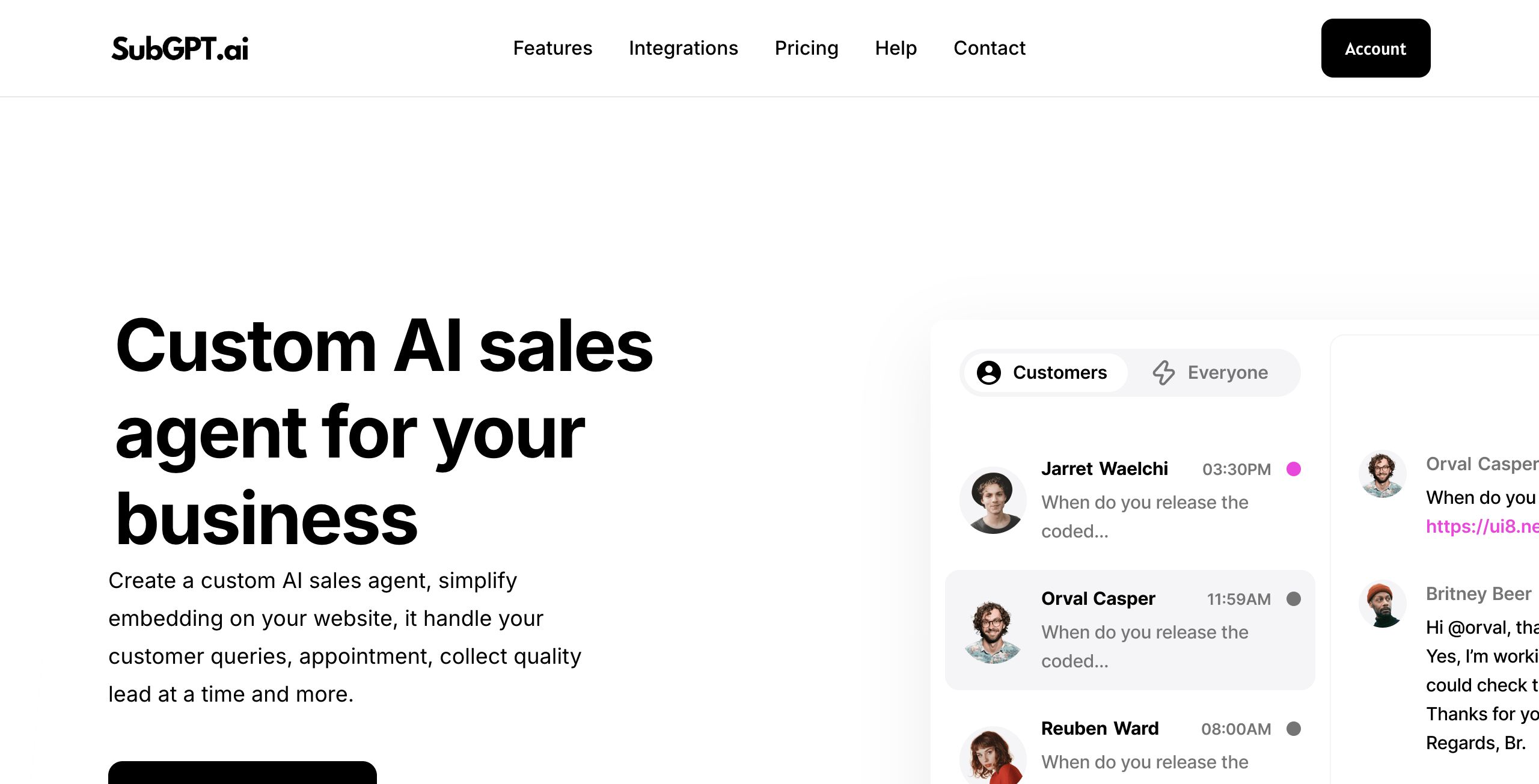 SubGPT is an innovative platform designed to empower businesses to develop customized AI assistants for their websites, transforming the way they engage with customers. This versatile tool excels in addressing customer inquiries, generating valuable leads, managing e-commerce transactions, scheduling appointments, and offering general supportβall while operating around the clock.