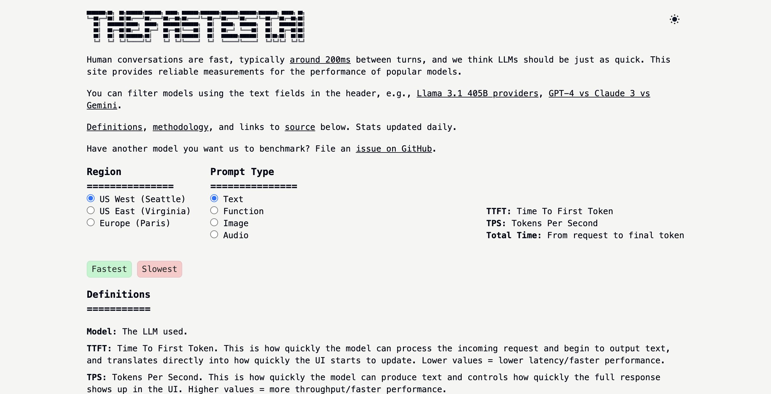 TheFastest.ai is a performance benchmarking tool specifically designed to measure and compare the speed of various large language models (LLMs). Targeted primarily at developers and businesses, the tool focuses on key performance metrics such as Time To First Token (TTFT), Tokens Per Second (TPS), and overall response times, answering a critical need in today’s competitive AI landscape. Given the increasing reliance on fast and efficient conversational AI interactions, TheFastest.ai is being reviewed as a valuable resource for assessing which LLMs can deliver the rapid responsiveness required in modern applications.