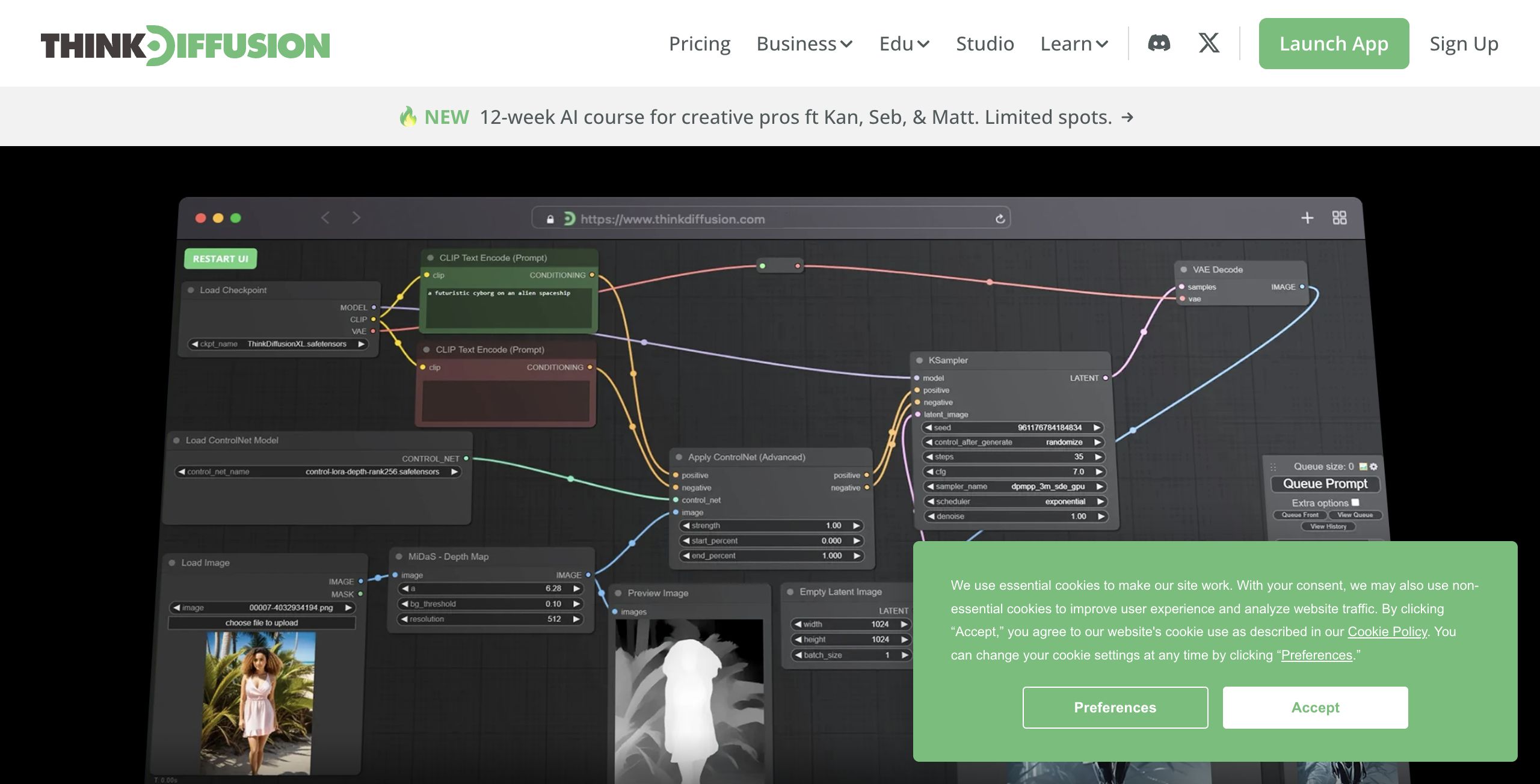 Think Diffusion appears to offer a tiered pricing model, including a free trial option as indicated by the "Try it free" prompt, and opportunities to upgrade to a "Go Pro" version. The presence of dedicated pricing pages for Business, Edu, and Studio plans suggests that the platform is designed to meet varied user needsβfrom individual creators to larger teams. Considering its rich feature set and efficient cloud infrastructure, the platform offers competitive value for creative professionals looking for a comprehensive AI art lab solution.