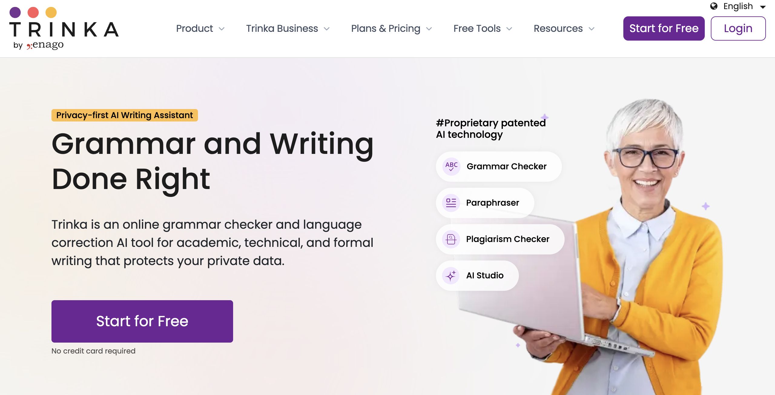 Trinka provides a flexible pricing structure visible on its website, including a Start for Free option with no credit card required. Additionally, business plans and multiple partnership models are available for enterprise users. While exact pricing details are not specified, the range of features—especially those designed for high-stakes academic and professional writing—positions Trinka as a competitively priced solution in its category.